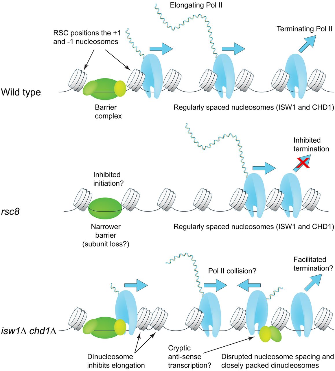 Roles of the RSC, ISW1, and CHD1 remodelers in Pol II initiation, elongation, and termination. RSC widens the promoter NDR by positioning the +1 and −1 nucleosomes farther apart to accommodate a complete barrier complex. CHD1 (short spacing) and ISW1 (longer spacing) compete to set nucleosome spacing on the gene using the +1 nucleosome as a reference. In rsc8 cells, nucleosomes shift toward the promoter but the spacing is the same as wild type; Pol II remains 3′ of the TTS. In isw1Δ chd1Δ cells, nucleosome spacing is disrupted, with the +2 nucleosome in particular being pushed against the +1 or +3 nucleosome. High cryptic initiation in these cells may result in collisions between transcribing cryptic antisense Pol II and promoter-initiated Pol II (elongation defect). Termination and/or dissociation in these cells may be faster.