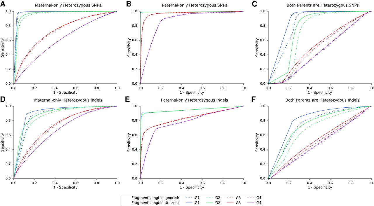 Performance of the model over SNPs and indels in families G1–G4. Presented in the ROC curves are results for families G1–G4, in three categories of either SNPs (A–C) or indels (D–F), as described. In positions where only one parent was heterozygous, we examined whether the shared allele was transmitted to the fetus (based on the true fetal genotype). If both parents were heterozygous, we examined whether the true fetal genotype was heterozygous or homozygous. The corresponding AUC and accuracy values are shown in Table 2.