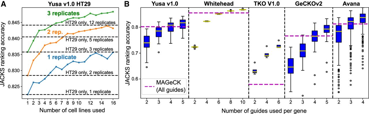 JACKS enables reduced screen size and cost. (A) Average JACKS ranking accuracy (y-axis) on HT29 cell line for increasing numbers of coprocessed cell lines (x-axis), and different number of technical replicates (colors). Two hundred cell lines were randomly sampled for each point on the graph and results averaged. As a reference, the same metric is plotted in increasing numbers of HT29 replicates (y-axis) processed by JACKS without the other cell lines (dashed lines). (B) JACKS ranking accuracy (y-axis) for increasing numbers of gRNAs (x-axis) from five different libraries (panels) using two replicates per cell line, compared to MAGeCK used on all five gRNAs and all available (two to four per cell line) replicates (dashed line). Box plot as in Figure 1C.