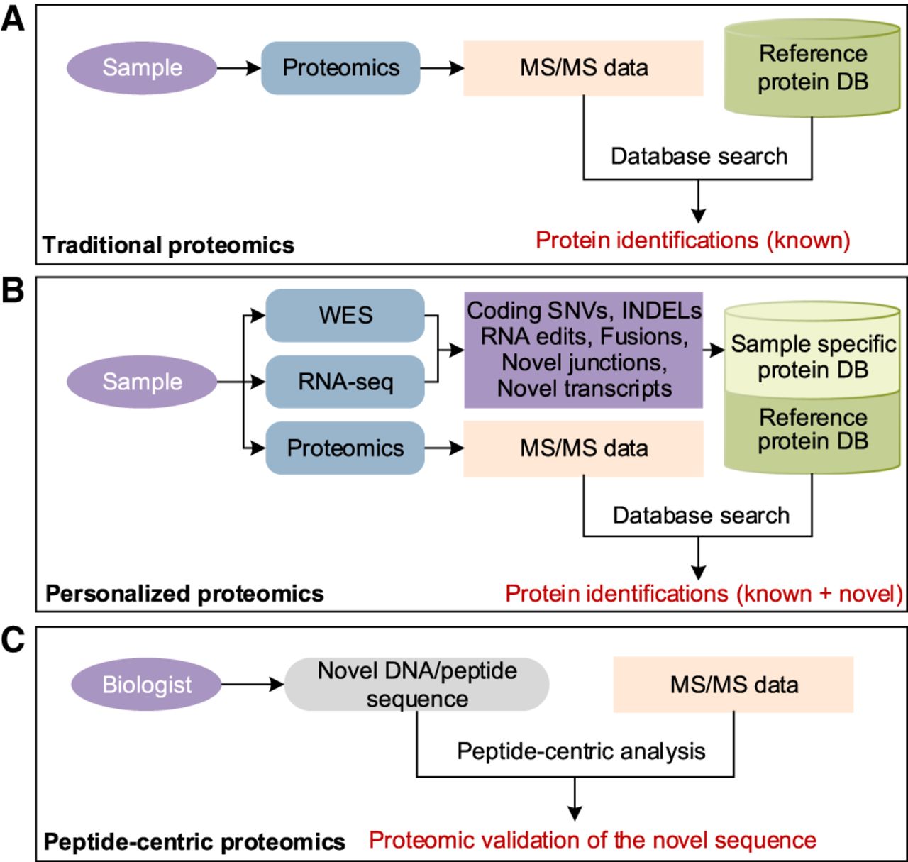 Proteomics data analysis strategies. (A) Traditional proteomics data analysis using a common reference protein database. (B) Proteogenomics approach using customized, sample-specific protein sequence databases. (C) Peptide-centric proteomics focuses on individual novel peptides of interest instead of interpreting all MS/MS spectra.