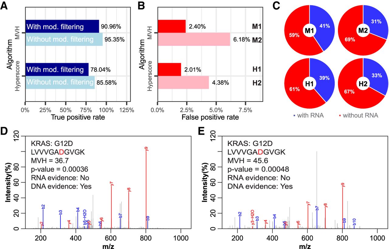 Evaluation of the performance of PepQuery for validating SAAVs in large data sets. (A) Sensitivity and (B) specificity evaluation for validating SAAVs in a large cancer data set. (C) A large proportion of the false positives in B are supported by RNA-seq evidence. (D,E) Two spectra supporting the KRAS G12D mutation in a sample, in which the mutation was supported by DNA but not RNA evidence.