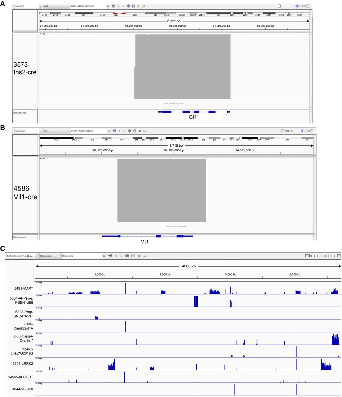 TLA reveals additional passenger cassettes and fragments in transgenes. (A,B) View of TLA reads (indicated in gray above the gene model) that map to the human growth hormone (GH1, also known as hGH) and the mouse metallothionein (Mt1) gene for two transgenes (Ins2-cre and Vil-cre, respectively), showing the inclusion of the entire gene structure, including coding exons. (C) Reads for nine transgenes mapped to the Escherichia coli genome indicating a variable level of coinsertion into the transgene integration site. Deep coverage for discrete loci shared between multiple lines indicates sequences that are part of the transgene vector. The amount of E. coli cointegration ranges from a few hundred bp to more than 200 kb. Short names for each transgene are used for readability and are defined in Supplemental Table S1.