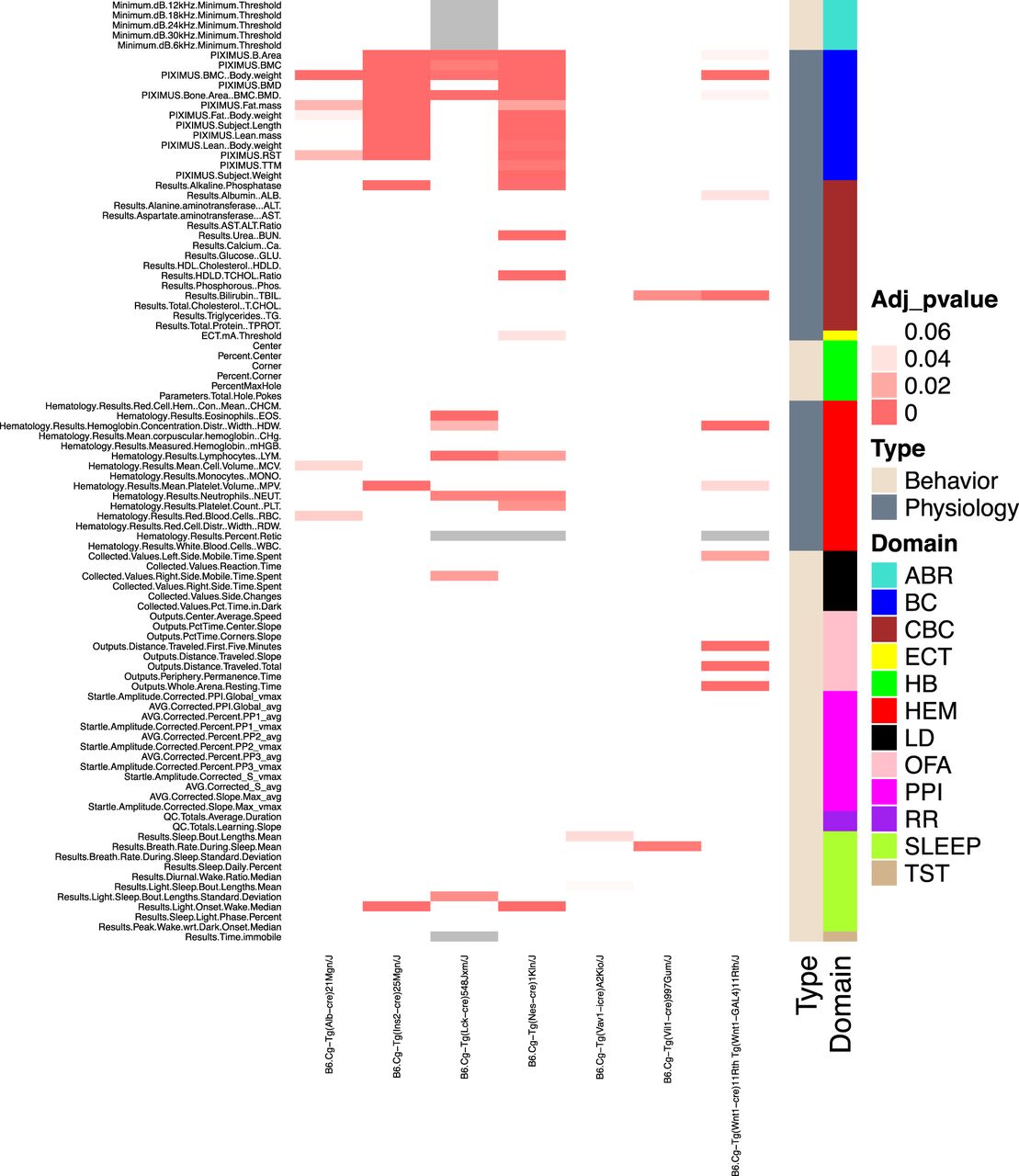 Physiology and behavioral testing of the cre transgenic lines in the KOMP pipeline. Mice were tested in 12 phenotypic domains spanning behavior and physiology (color-coded, right bar). Each test is further grouped broadly into behavior (peach) or physiology (gray) domains. Significant differences from controls are shown in the heatmap (FDR-corrected P-values). Individual output parameters are listed and color-coded on the left y-axis. Tests with no data are shown in gray. (ABR) Auditory brainstem response; (HB) hole board; (LD) light/dark transition; (OFA) open field assay; (PPI) pre-pulse inhibition; (RR) rotarod; (SLEEP) piezoelectric sleep/wake; (TST) tail suspension test; (BC) body composition; (CBC) clinical biochemistry; (ECT) electroconvulsive seizure threshold; (HEM) hematology. Homozygous transgenic lines: Alb-cre [B6.Cg-Tg(Alb-cre)21Mgn/J], Ins2-cre [B6.Cg-Tg(Ins2-cre)25Mgn/J], Lck-cre [B6.Cg-Tg(Lck-cre)548Jxm/J]. Hemizygous transgenic lines: Nes-cre [B6.Cg-Tg(Nes-cre)1Kln/J], Vav1-cre [B6.Cg-Tg(Vav1-icre)A2Kio/J], Vil1-cre [B6.Cg-Tg(Vil1-cre)997Gum/J], Wnt1-cre [B6.Cg-Tg(Wnt1-cre)11Rth Tg(Wnt1-GAL4)11Rth/J].