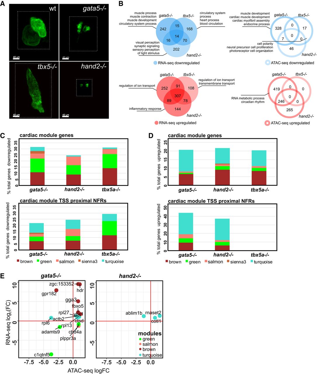 Loss-of-function mutations of cardiac TFs alters regulatory networks involved in heart development. (A) LSFM images of GFP-labeled CMs of wild-type and TF mutant zebrafish hearts at 72 hpf. The dotted line indicates exact area of the LSFM image. (B) Venn diagrams and GO enrichment analysis of TF mutant down-regulated (blue) and up-regulated (red) genes and chromatin accessibility of proximal promoter NFRs (±3 kb of TSS), adjusted P-value ≤ 0.05. (C) Percent distribution of cardiac module down-regulated genes/proximal NFR chromatin accessibility as compared to total number of TF mutants down-regulated genes/proximal NFR chromatin accessibility. (D) Percent distribution of cardiac module up-regulated genes/proximal NFR chromatin accessibility as compared to total number of TF mutants up-regulated genes/proximal NFR chromatin accessibility. (E) Cardiac module genes with differentially regulated expression and chromatin accessibility of proximal promoter NFRs (±3 kb of TSS) in gata5, hand2, and tbx5a mutants.
