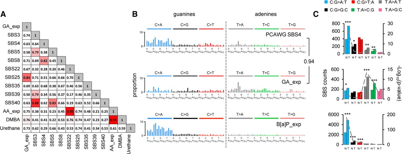 Comparison of GA signature to known signatures. (A) Cosine similarity matrix comparing GA mutational signature with the human PCAWG data (SBS3, -4, -5, -8, -22, -25, -35, -39, and -40) and other A > T-rich mutational signatures from experimental exposure assays using specific carcinogens (7,12-dimethylbenz[a]anthracene [DMBA], urethane, and aristolochic acid [AA]). (B) Comparison of PCAWG SBS4 with two experimentally derived signatures: B[a]P_exp = benzo[a]pyrene mutational signature extracted from HMECs; GA_exp = GA mutational signature extracted from MEF cells. Cosine similarity between the T > N (adenine) components of SBS4 and GA signature is shown on the right. (C) Transcription strand bias analysis for the six mutation types underlying the signatures in panel B. For each mutation type (using the pyrimidine convention), the number of mutations occurring on the transcribed (T) and nontranscribed (N) strand is shown on the left y-axis. The significance is expressed as –log10(P-value) indicated on the right y-axis. (***) P < 10−8, (**) P < 10−4, (*) P < 10−2.