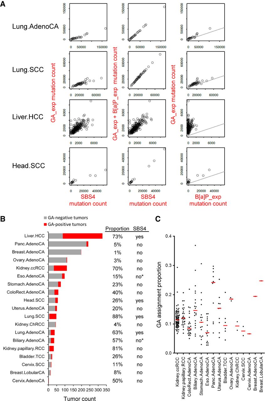 Identification of experimental GA signature in the human cancer PCAWG data sets. (A) Scatter plots of the experimental GA_exp and B[a]P_exp mutational signature assignments by mSigAct show reconstruction of tobacco-smoking signature SBS4 assignments in cancer types with SBS4 present. (Lung.AdenoCA) Lung adenocarcinoma, (Lung.SCC) lung squamous cell carcinoma, (Liver.HCC) liver hepatocellular carcinoma (Head.SCC) head squamous cell carcinoma. The combination of GA_exp and B[a]P_exp mutation counts reconstructed SBS4 mutation counts in Lung.AdenoCA and Lung.SCC and, to an extent, in Head.SCC. In liver HCCs, GA counts alone partially reconstructed SBS4 mutation counts and indicate GA_exp-positive and B[a]P_exp-negative tumors (third row, right scatter plot). The lines in GA versus B[a]P scatter plots have a slope of 0.3, reflecting the 3:1 ratio of B[a]P:GA mutation counts that reconstruct SBS4. (B) Summary of GA mutation assignment analysis of 1584 individual tumors of 19 cancer types from the PCAWG data sets. Assignments were performed using mSigAct (positivity was determined by the signature.presence.test tool at FDR < 0.05) with the PCAWG annotations of signature present in each subtype, in addition to the GA and B[a]P signatures. The tumor types manifesting or lacking SBS4 signature of tobacco smoking are labeled accordingly in the column SBS4. Asterisk denotes borderline SBS4 presence in PCAWG Billiary.AdenoCA (two of 173, 1.16%) and Eso.AdenoCA (two of 347, 0.06%). Proportion indicates percentage of GA-positive tumors within each listed cancer type. (C) The dot plot shows the proportion of mutations assigned to GA signature among other identified signatures (see Supplemental Material) in individual tumors of cancer types not showing the direct effects of tobacco smoking (i.e., lacking signature SBS4). Red horizontal lines denote median values (y-axis, 1 = 100%).