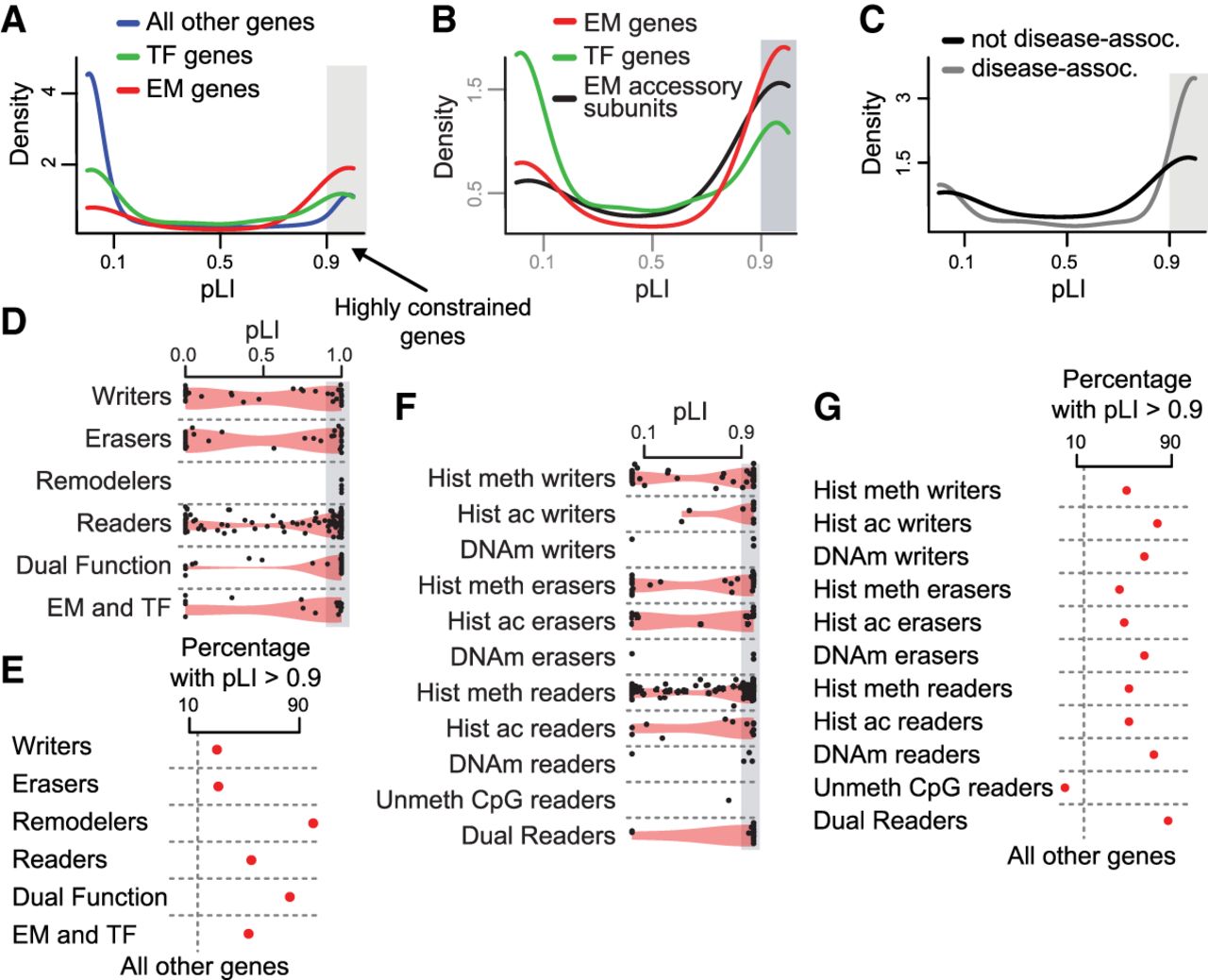 A large subset of epigenetic regulators are very intolerant to variation. (A) The pLI distributions of EM genes (red curve), TF genes (green curve), and all other genes (blue curve). (B) The pLI distributions of EM genes (red curve), genes encoding for accessory subunits of EM protein complexes (black curve), and TF genes (green curve). (C) The pLI distribution of disease-associated EM genes versus non-disease–associated EM genes. (D–G) The pLI distributions (D,F) and percentage of genes with pLI > 0.9 (E,G) of individual classes of EM genes. The shaded gray area (A–D,F) indicates highly constrained genes (>0.9). The vertical dashed gray line (E,G) corresponds to the percentage of all other genes with pLI > 0.9.