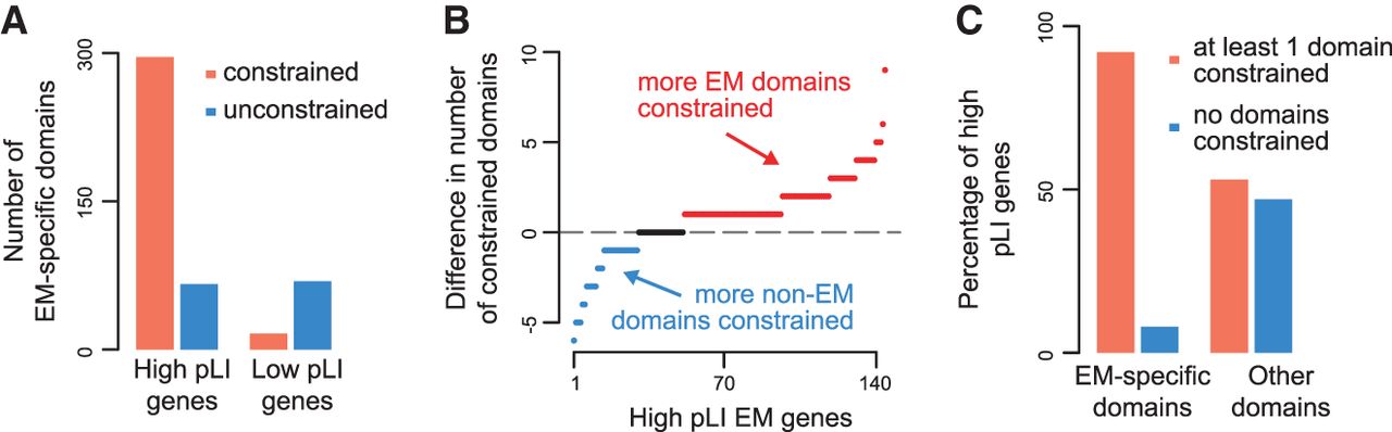 The protein domains known to mediate epigenetic functions drive the observed constraint of EM genes. (A) The number of constrained and unconstrained EM-specific protein domains of high pLI (>0.9) EM genes versus low pLI (<0.1) EM genes. (B) The within-gene differences in the total number of EM-specific constrained domains versus other constrained domains. Each dot corresponds to a gene. Red dots indicate genes with more EM-specific constrained domains; blue dots indicate genes with more other constrained domains; black dots indicate genes with an equal number of constrained EM-specific and other domains. (C) The percentage of high pLI EM genes with at least one constrained EM-specific domain versus the corresponding percentage with at least one constrained other domain.