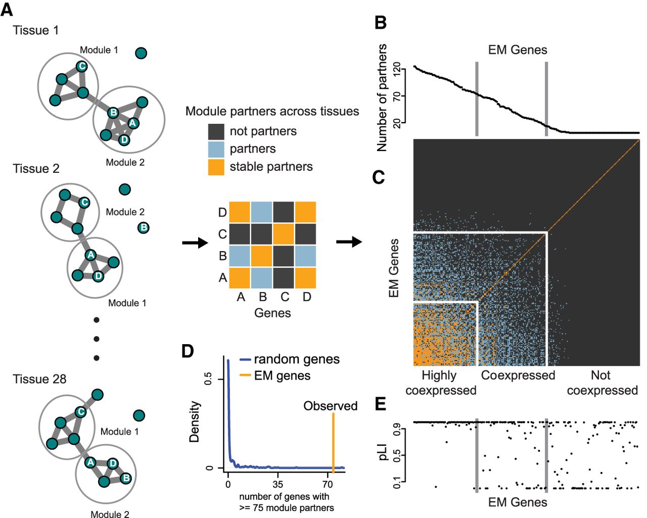A large subset of the components of the epigenetic machinery exhibit unusually high levels of coexpression. (A) Schematic illustrating our definition and identification of module partners. WGCNA was used to construct tissue-specific coexpression networks and modules for 28 tissues profiled in GTEx. We determined if two EM genes were module partners (part of the same module in 10–14 tissues) or stable module partners (part of the same module in >14 tissues). (B,C) The number of module partners for each EM gene and the module partner matrix, where rows and columns are ordered as in B. We define three groups of EM genes—highly coexpressed, coexpressed, and not coexpressed—based on their number of module partners. (D) The pLI for each EM gene, ordered by its number of module partners as in B. (E) The size of the (highly) coexpressed group of EM genes compared to 300 draws of 270 random genes, in which the random genes are selected to have a similar expression level across tissues compared to EM genes (Supplemental Fig. S10).