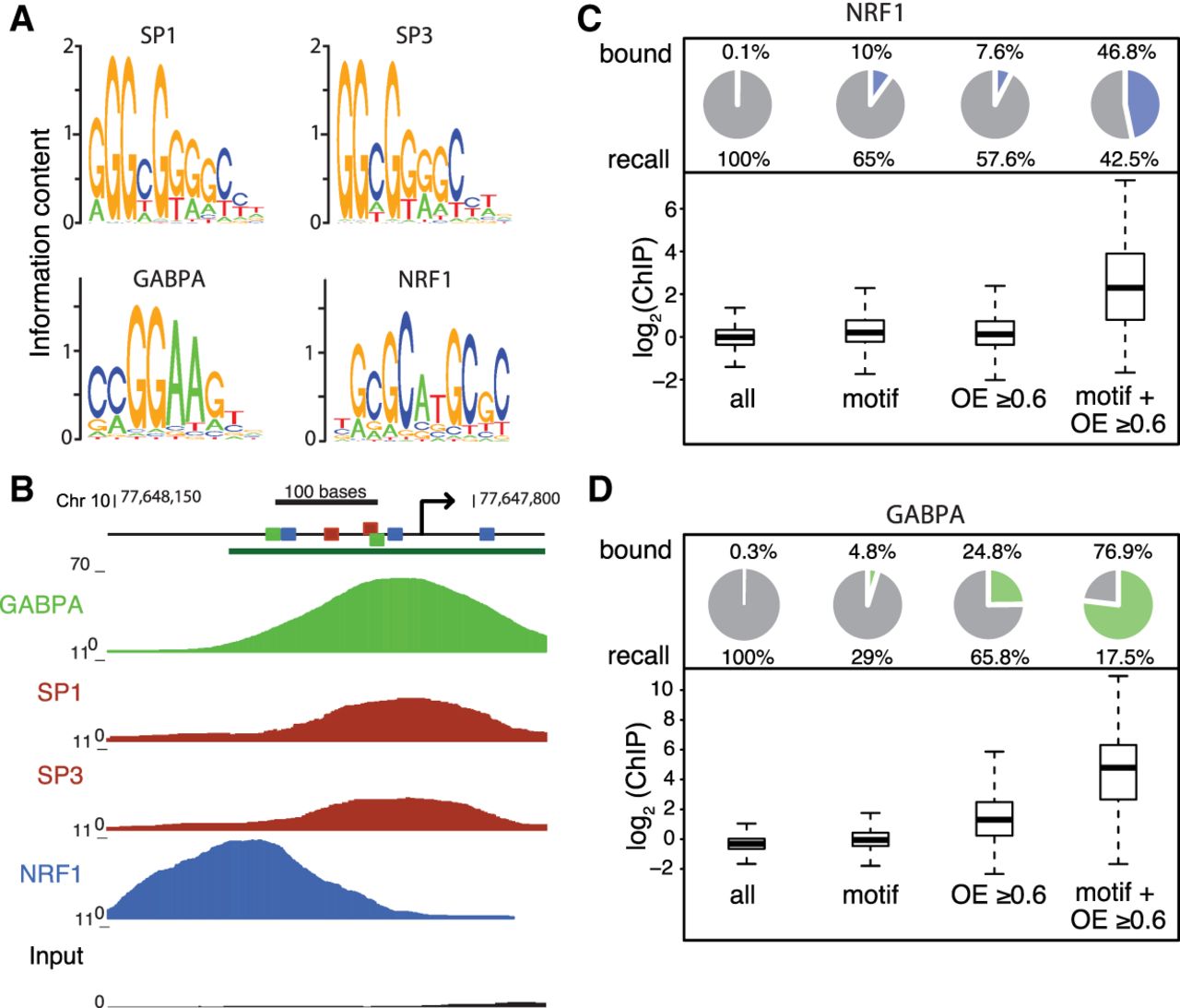 Bound TF motifs are enriched in CpG islands. (A) Position weight matrices of SP1, SP3, GABPA, and NRF1 as inferred from the respective ChIP-seq peaks. (B) Browser screenshot of SP1, SP3, GABPA, and NRF1 ChIP-seq data sets at the Pwp2 promoter. Predicted TF motifs for the respective factors are highlighted as colored squares; the green bar indicates a CpG island. (C) High CpG density and TF motif occurrence combined result in the largest enrichment of bound TF motifs. Pie charts show, for different subsets, the percentage of NRF1-bound genomic windows (600-nt tiling windows, log2 enrichment over input >2.5), with the percentage indicated above the pie chart (bound); (recall) percentage of all bound genomic windows that are part of each subset. Corresponding box plots of log2 ChIP enrichments are shown below the pie charts. (All) All windows, (motif) windows containing a motif that has a log-odds score ≥ 12 (log2 scale), (OE ≥ 0.6) windows with an OE ≥ 0.6, (motif + OE ≥ 0.6) windows with both a motif with a log-odds score ≥ 12 and an OE ≥ 0.6. (D) Same as in C for the first replicate of GABPA.