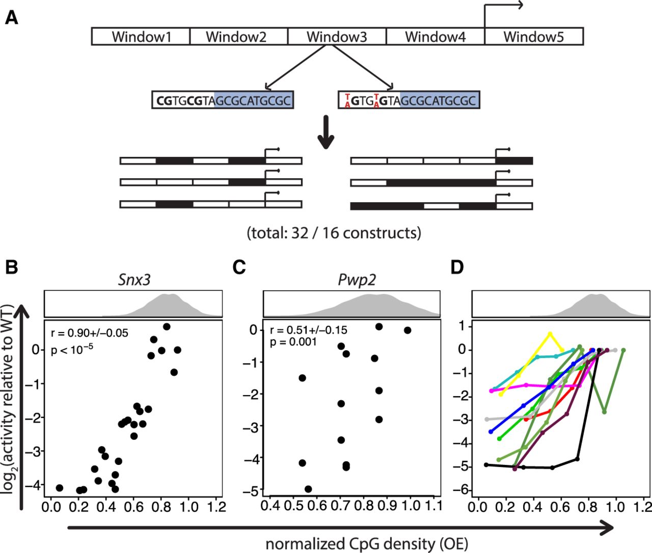 Normalized CpG density correlates with transcriptional activity. (A) Mutation strategy. Promoters were mutated in windows, in which all Cs within CpGs that were not a part of a complex motif of TFs with a ChIP-seq peak at the promoter were mutated to Ts (for Snx3) or As (for Pwp2). WT and mutant windows were assembled in all possible combinations and assayed for transcriptional activity. The windows in the Snx3 promoter had 5, 10, 6, 9, and 12 CpGs, respectively, and ranged from 50–120 bp in size. For Pwp2, windows of 70–150 bp with 8, 7, 7, and 7 CpGs, respectively, were mutated. The numbers 32 and 16 indicate the number of constructs for Snx3 and Pwp2, respectively, the large majority of which led to a transcriptional read-out. (B) Presence of CpGs positively correlates with transcriptional activity. Scatter plot of normalized CpG density versus transcriptional activity of Snx3 promoter mutants. The histogram above the scatter plot depicts the normalized CpG density distribution within promoters overlapping CGIs. The average Spearman's correlation coefficient of all three replicates (±1 SD) and its significance is indicated in the upper left part of the plot. P-values were determined based on an approximate permutation test (see Methods). (C) Same as in B for the Pwp2 promoter. Due to low coverage of BCs for this promoter series, in this case we adjusted the threshold on the minimal number of required BCs per promoter mutant to 1. (D) Positive correlation of normalized CpG density with transcriptional activity is a general feature in promoter mutant libraries. Scatter plot showing normalized CpG density versus transcriptional activity in the reporter assay for 11 promoters. Mutant promoters were generated by random mutation of Cs to As within CpGs if they were not part of complex motifs of TFs that have a ChIP-seq peak at the promoter. Different numbers of CpGs were mutated to generate five different normalized CpG densities per promoter.