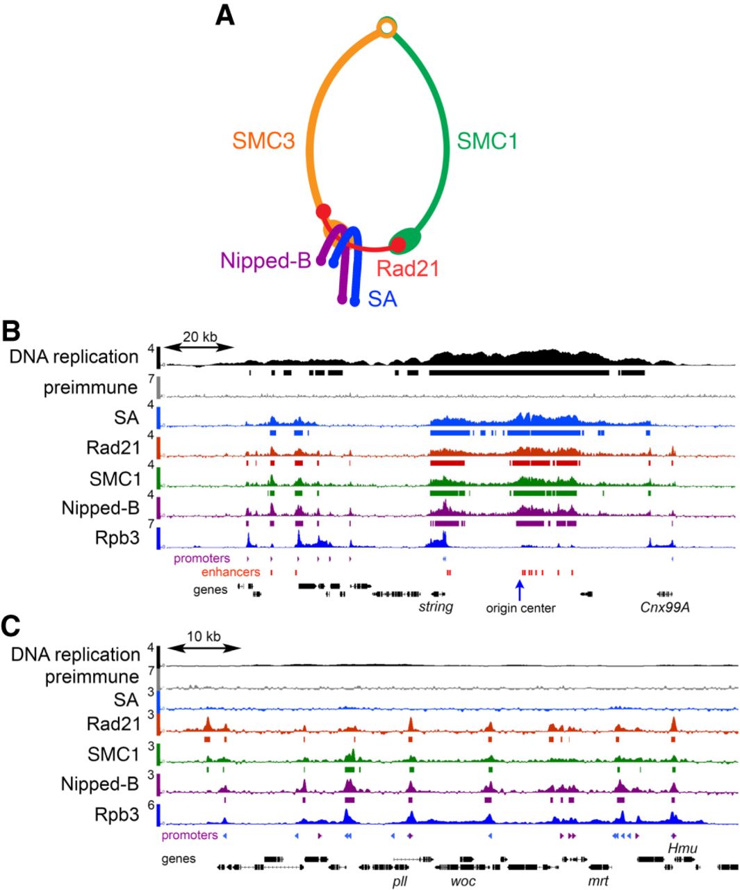 Cohesin and Nipped-B ChIP-seq in BG3 cells. (A) Cohesin subunit structure. (B) ChIP-seq near an early DNA replication origin at the string (stg, also known as cdc25) gene. ChIP-seq and DNA replication data are plotted as log2 enrichment. Bars below each track indicate enrichment in the 95th percentile over regions ≥300 bp. RpII33 (also known as Rpb3) RNA polymerase II subunit data are from a prior publication (Pherson et al. 2017). Locations of promoters (purple and blue, forward and reverse) and enhancers (red) are indicated below the tracks. (C) ChIP-seq in a region distant from an early replication origin containing the woc (without children) gene.