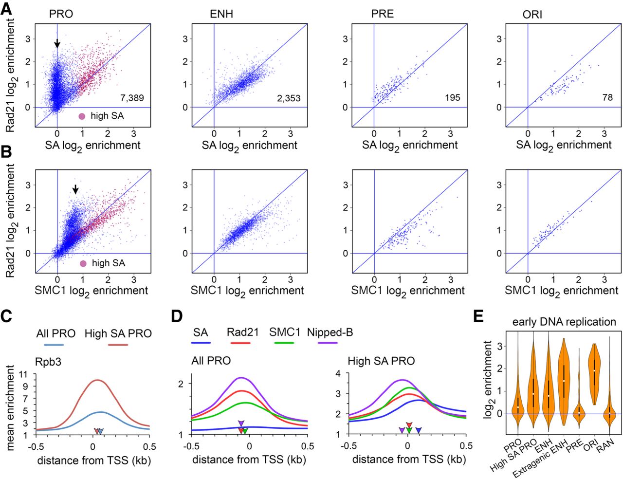Nipped-B, Rad21, and subproportional SMC1 occupy most active promoters without SA in BG3 cells. (A) Dot plots of SA versus Rad21 enrichment at promoters (PRO), enhancers (ENH), PREs (PRE), and origin centers (ORI). The numbers of each feature type are indicated in the plots. Promoters with high SA enrichment (95th percentile over regions ≥300 bp) are plotted in red. The black arrow indicates promoters with Rad21 but no SA. (B) Dot plots of SMC1 enrichment versus Rad21 enrichment at the indicated feature types. The black arrow indicates promoters with subproportional SMC1. (C) Rpb3 (Pol II) promoter meta-analysis for active promoters (blue) and the subset occupied by SA (high SA, red). Blue and red arrowheads on the x-axis indicate the positions of peak enrichment. (D) SA (blue), Rad21 (red), SMC1 (green), and Nipped-B (purple) promoter meta-analysis for all promoters (All PRO) and the subset occupied by SA (High SA PRO). The purple, red, green, and blue arrowheads on the x-axes indicate peak enrichment for Nipped-B, Rad21, SMC1, and SA. SA peak enrichment is indicated only for high SA promoters. (E) Violin plots showing enrichment of early replicating DNA for all active promoters (PRO), promoters occupied by SA (High SA PRO), enhancers (ENH), the subset of enhancers positioned at least 500 bp outside of a transcribed region (Extragenic ENH), PREs (PRE), centers of replication origins (ORI), and randomly positioned sequences (RAN).