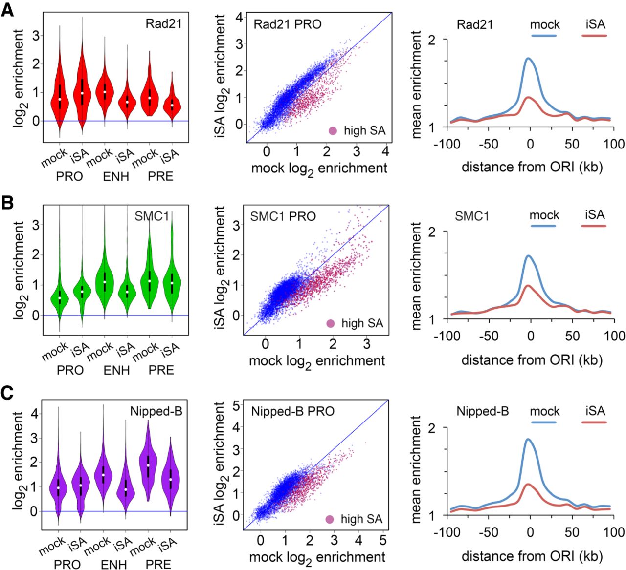 SA targets Rad21, SMC1, and Nipped-B to enhancers and origin-proximal promoters in BG3 cells. An example of SA protein depletion is in Supplemental Figure S3A. (A) Effects of SA depletion (iSA) on Rad21 localization. Violin plots (left) show the distribution of Rad21 enrichment at promoters (PRO), enhancers (ENH), and PREs (PRE) in mock control cells and cells depleted for SA. Promoter dot plots (middle) show enrichment in mock control cells versus SA-depleted cells. High SA promoters are plotted in red. Origin meta-analysis (right) shows Rad21 distribution surrounding early replication origins in mock control cells (blue) and SA-depleted (iSA) cells (red). (B) Effects of SA depletion on SMC1 location. (C) Effects of SA depletion on Nipped-B localization. Median values for all occupancy distributions and Wilcoxon P-values for mock versus SA depletion are in Supplemental Table S2. All occupancy changes are statistically significant except for SMC1 at PREs.