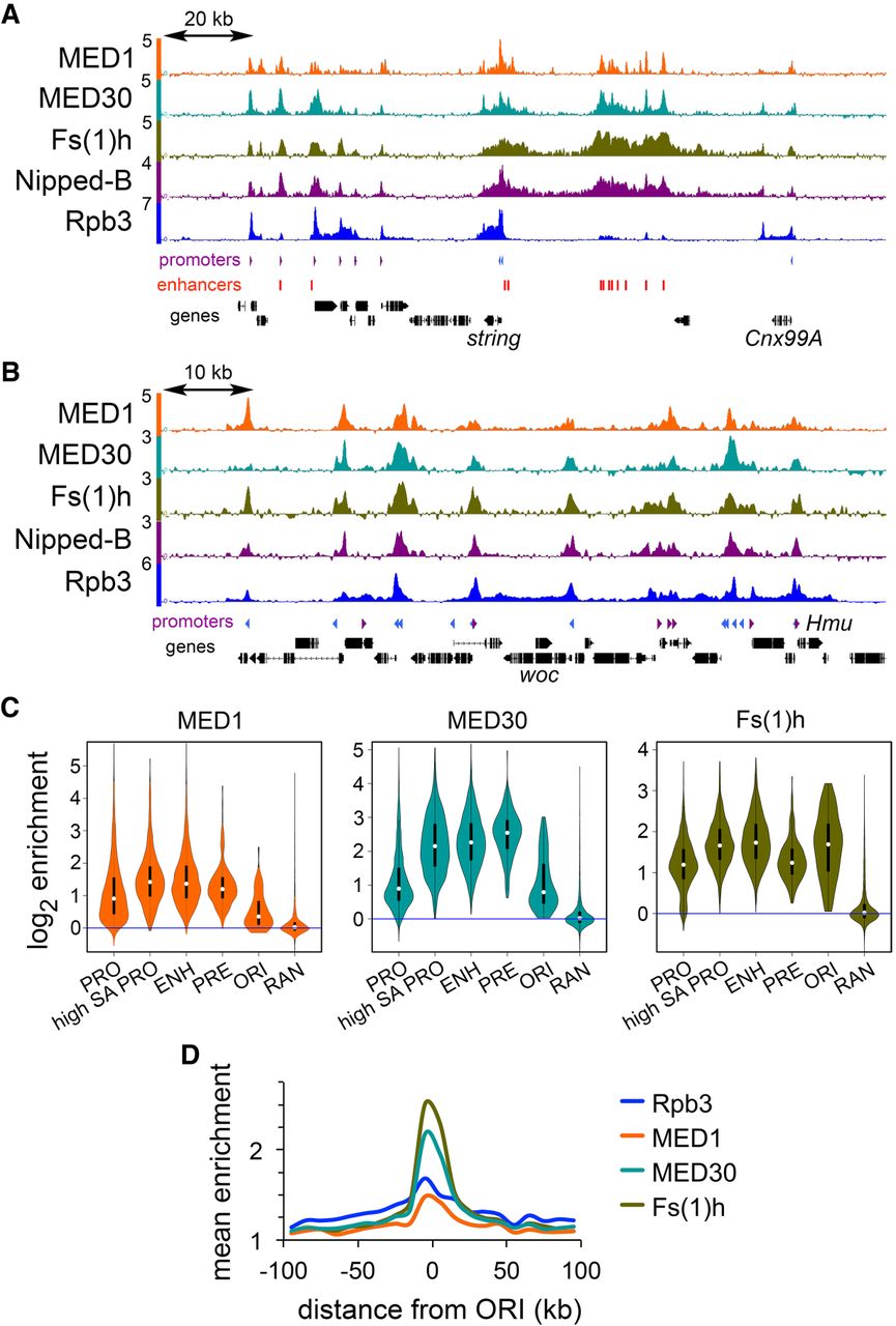The MED30 Mediator subunit and Fs(1)h BET domain protein colocalize with Nipped-B and are origin-centric in BG3 cells. (A) ChIP-seq for the indicated proteins in an origin-proximal region containing the string (cdc25) gene. (B) ChIP-seq for the indicated proteins in an origin-distal region containing the woc gene. (C) Violin plot distributions for MED1 (orange), MED30 (cyan), and Fs(1)h (olive) occupancy at all active promoters (PRO), SA-occupied promoters (high SA PRO), enhancers (ENH), PREs (PRE), centers of early DNA replication origins (ORI), and randomly positioned sequences (RAN). (D) Meta-origin analysis of Rpb3 (blue), MED1 (orange), MED30 (cyan), and Fs(1)h (olive) occupancy.