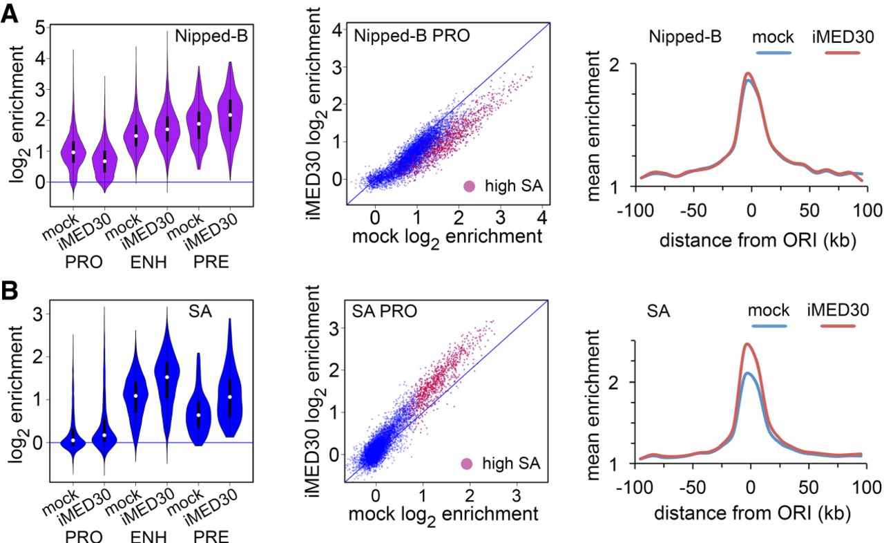 The MED30 Mediator subunit facilitates Nipped-B association with promoters in BG3 cells. An example of MED30 protein depletion is in Supplemental Figure S3A. (A) Effects of MED30 depletion (iMED30) on Nipped-B localization. (B) Effects of MED30 depletion on SA localization. All changes in Nipped-B and SA occupancy are statistically significant except at the centers of early origins (Supplemental Table S2).