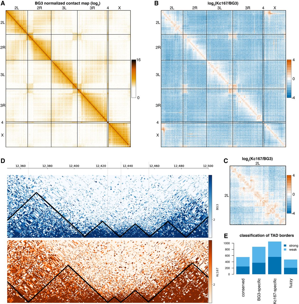 A high-resolution contact map of Drosophila BG3 cells. (A) Genome-wide normalized contact map of the Drosophila BG3 cell line at 100-kb resolution. Each element in the matrix represents the log2 of the normalized number of contacts between the two corresponding bins. (B) The log2 ratio between the normalized number of contacts in BG3 cells and Kc167 cells as indicated. (C) The log2 ratio between the normalized number of contacts in BG3 cells and Kc167 cells on Chromosome 2L. (D) Triangle view of the normalized contact map in BG3 cells at 2L:12,350,000–12,500,000 locus. Black lines demarcate the TADs. (E) Classification of TAD borders in BG3 cells as described in the main text: conserved borders, BG3-specific borders, Kc167-specific borders, and fuzzy borders. Depending on whether the TAD borders can still be detected when increasing the stringency of the TAD calling algorithm, we split each class of TAD border into two subgroups: strong borders and weak borders.