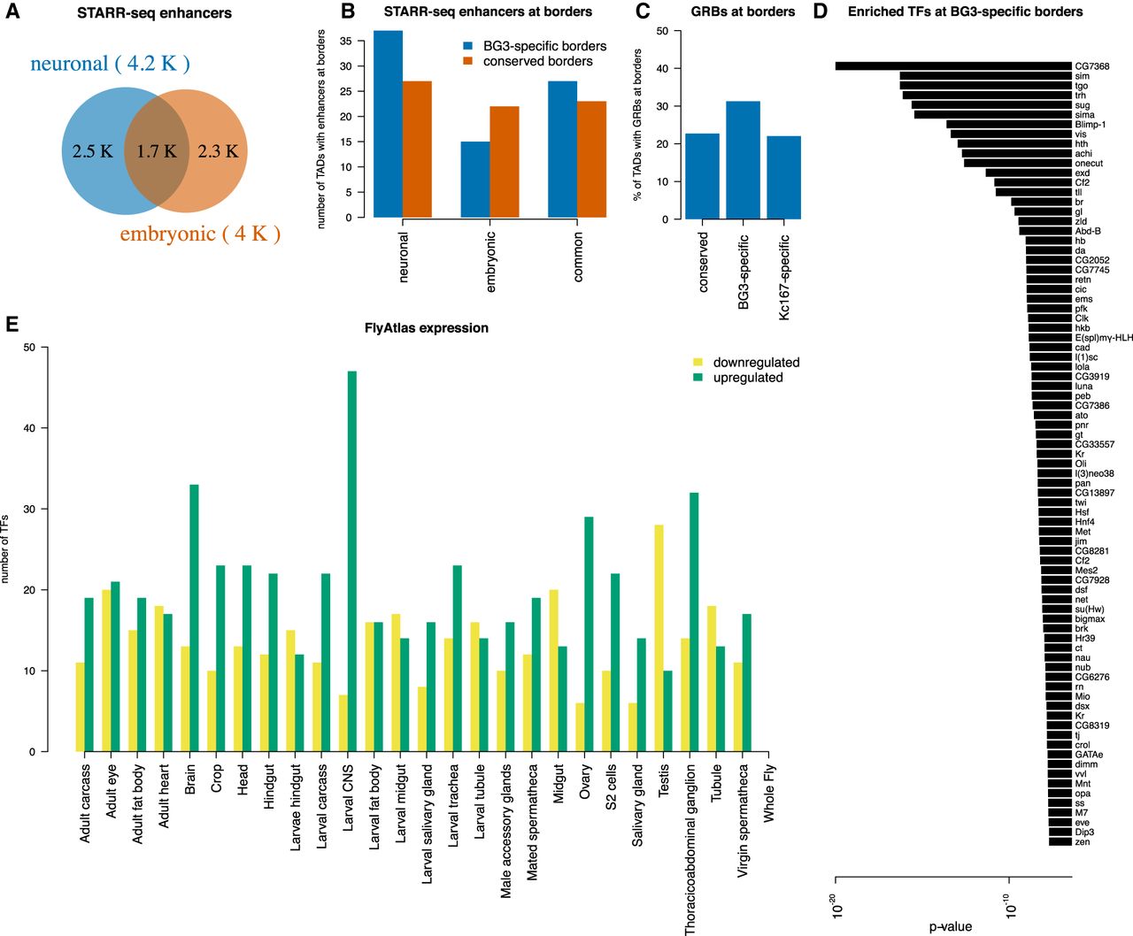 Cell-type–specific enhancers correlate with cell-type–specific TAD borders. (A) Venn diagram representing the number of enhancers in neuronal and embryonic Drosophila cells as identified by STARR-seq. Enhancers were classified as cell specific if they were annotated only in one cell type or as common if they were annotated in both cell types. (B) The number of conserved (red) or BG3-specific (blue) TAD borders that overlap with a cell-type–specific or common enhancer. Barplot showing more BG3-specific borders with neuronal enhancers than with common or embryonic enhancers, unlike conserved TAD borders. (C) The percentage of TAD borders that overlap with gene regulatory blocks (GRBs) (Harmston et al. 2017). A higher number of BG3-specific borders overlap with GRBs compared with conserved borders (Fisher's exact test P-value = 0.022) or Kc167-specific borders (Fisher's exact test P-value = 0.0021), but there is no difference between conserved borders and Kc167-specific borders (Fisher's exact test P-value = 0.86). (D) List of 81 TFs with enriched motifs at BG3-specific borders and the associated P-value (see Methods). (E) Expression of 79 of these TFs in different tissues/cells from FlyAtlas data set. Green represents up-regulated genes; yellow, down-regulated genes as indicated.