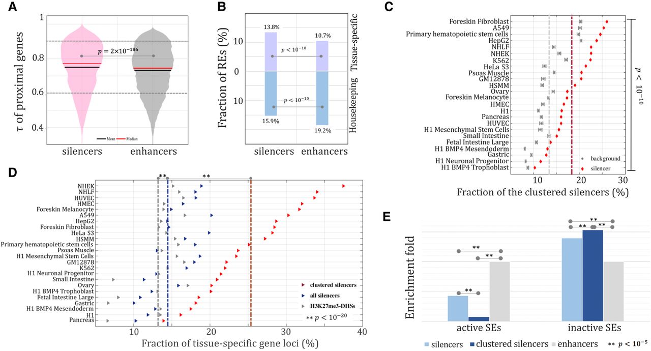 Distribution of silencers. τ of genes flanking silencers and enhancers (A) and fraction of tissue-specific (τ > 0.9) and housekeeping (τ < 0.6) gene loci harboring silencers or enhancers (B). (C) Clustering of silencers. Background clustering was established using randomly selected H3K27me3-DHSs peaks matching the number of silencers. The dashed lines indicate the average fraction of clustered elements across all cell lines (red = silencers, gray = background). (D) Association of silencers and silencer clusters with tissue-specific genes. (E) Enrichment of clustered silencers in the loci of superenhancers (SEs). Enhancers were used as a background reference.