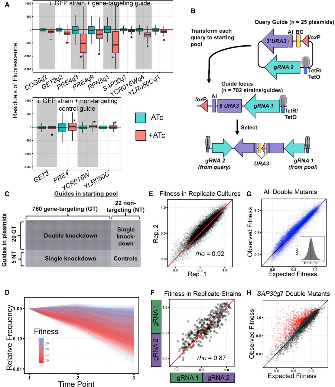Rapid double CRISPRi strain generation and parallel fitness measurement of approximately 17,000 mutants. (A) Boxplots depicting the distributions of residuals for GFP-tagged strains carrying either a gene-targeting (i), or nontargeting control (ii) CRISPRi plasmid and grown for 4 h in inducing (+ATc; red) or noninducing (−ATc; turquoise) conditions. Residuals were calculated from a loess regression fit to the uninduced sample (for details, see Methods). Asterisks indicate significant changes in distributions upon induction with ATc (P < 10−8 by Student's t-test). (B) Constructs used during the generation of double CRISPRi strains via transformation of a query plasmid into a pool of starting strains. (AI) Artificial intron; (BC) DNA barcode. (C) Guide combinations resulting in the single-, double-, and no-gene knockdown control strains generated for this study (for details, see Methods). (D) Representative normalized relative frequency trajectories from pooled fitness assay of approximately 17,000 strains in one replicate culture of YPD; time points are collected every 24 h. Trajectories are used to estimate fitness. Raw count data are derived from amplicon sequencing. (E,F) Reproducibility of fitness from pooled assay across two replicate YPD cultures with 24-h transfer time (E; approximately 17,000 strains) and replica strains carrying the same two gRNA sequences in reverse orientations (F; 78 pairs of strains in each of five conditions). Spearman's rho for each comparison is displayed. (G) Observed double-mutant fitness compared with expectation calculated using the multiplicative model. Inset is a histogram of residuals from expectation for each observed double mutant; vertical line is at x = 0. (H) Same plot as in G, but only for SAP30g7 containing double knockdowns. Red points have a z-score >2. For E–H, diagonal lines are y = x. For F–H, data are shown from all five growth conditions.