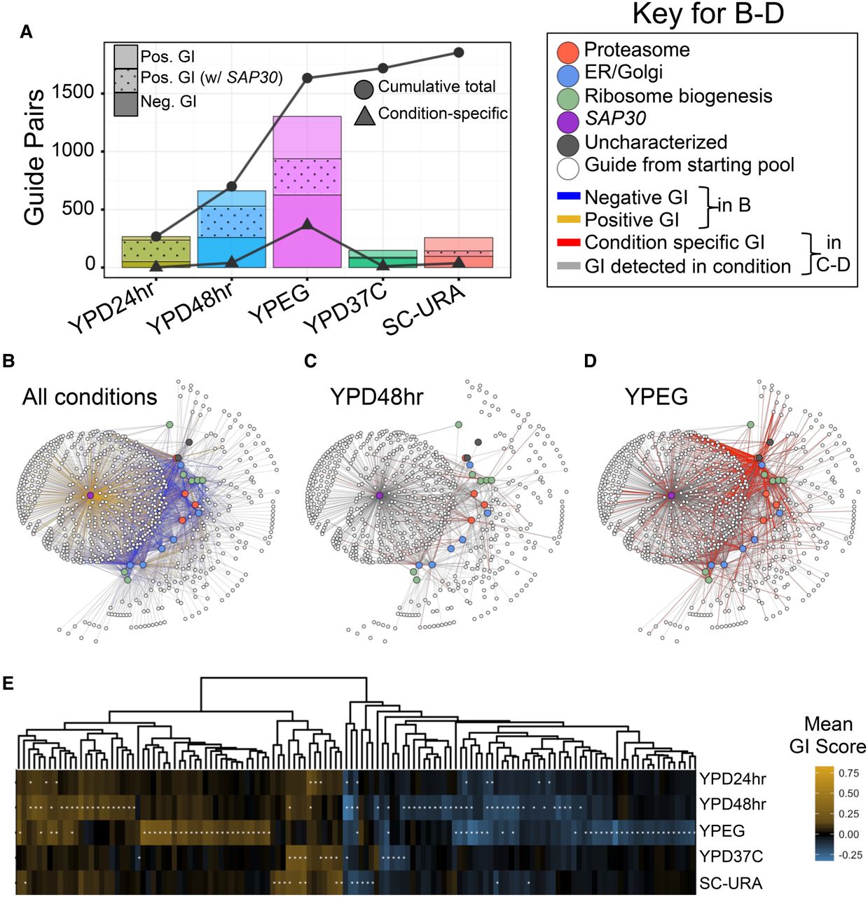 Condition-specific versus condition-independent GIs detected via CRISPRiSeq in five conditions. (A) Bar plot depicting number of significant GIs detected between guide pairs in each of five growth conditions tested. Negative and positive GIs are distinguished by shading, and positive interactions with SAP30 have a dotted pattern. Lines indicate the cumulative total of unique interactions (circles) and condition-specific interactions (triangles). (B–D) Network diagrams of significant interactions measured in at least one condition (B), YPD media with a 48-h transfer time (C) or YP + ethanol + glycerol media (D). Nodes represent guides; query guides are colored by their target's biological process. In B, blue edges are negative interactions; gold are positive. In C,D, gray edges are interactions detected in the condition; red are condition-specific. (E) Heatmap depicting mean GI score across three to 10 replicate strains for gene pairs passing significance in at least one condition (95% CI nonoverlapping with absolute z-score of one; denoted with asterisk). For gene pair labels, see Supplemental Figure S8.