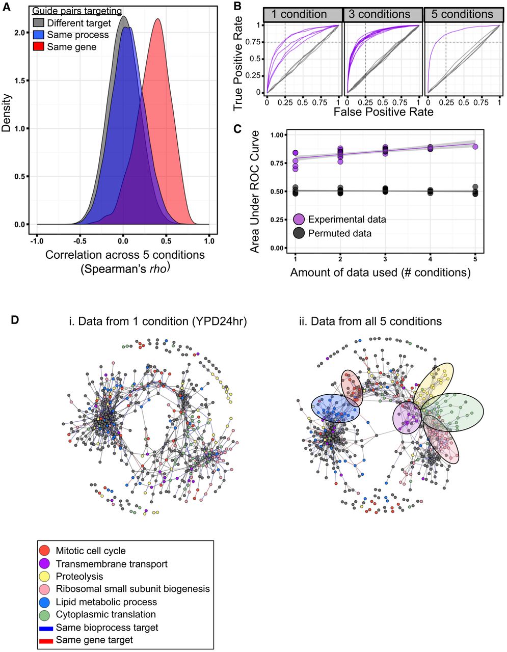 Screening in multiple conditions improves functional classification. (A) Density distributions depicting GI profile similarity of pairs of guides targeting the same gene (n = 422), targeting the same bioprocess (n = 36,029), or having different gene and bioprocess targets (n = 239,202). (B) Receiver operating characteristic (ROC) curves depicting true-positive and false-positive rates when predicting whether a starting pool guide pair targets the same gene based on GI profile similarity using different thresholds of Spearman's rho. Analysis was performed on all possible subsets of the data set for one and three conditions. Experimental data are purple; permuted data, gray. (C) The area under the ROC curves from B. (D) Network diagrams built from data from one condition (YPD24hr; i) or from the entire data set (ii). Nodes represent starting pool guides and are colored by bioprocess of target gene (for bioprocesses where a region of enrichment in the network was detected). Edges link nodes with similar GI profiles and are colored by whether the guide pair targets the same gene (red) or same bioprocess (blue).