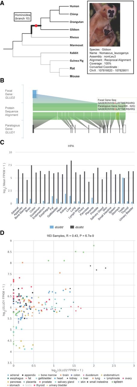 Representative sections in the gene page of GenTree database showing the evolutionary and functional features of GLUD2. (A) Branch view of GLUD2. When the mouse is placed over the branch on which GLUD2 originated, the top left tooltip shows the inferred age, that is, branch 10. For the external leaf node, the black line indicates the syntenic alignment, and the gray line indicates the nonsyntenic alignment. When the mouse is placed over an external node, that is, gibbon, the top right tooltip shows the alignment details in this species. Photo courtesy of Jim Zuckerman, Gibbon Conservation Center. (B) Paralogous alignment between GLUD2 and its parental gene, GLUD1. The top row shows the gene structure of GLUD2 with the open reading frame (ORF) indicated in a blue block and the untranslated region (UTR) indicated in an unfilled block. The gene structure of GLUD1 on the bottom is likewise indicated. The diagram in the center shows the protein alignment at the exon level, which is triggered by mouse-over. Mismatches are indicated in red. Users can zoom into a specific region of interest. (C) HPA transcriptome profile across tissues for the two paralogs. For each tissue, the mean expression across replicates is shown as the log2-transformed FPKM value. (D) Scatter plot view of expression intensity. Users can disable samples from some tissue (e.g., testis) and zoom into an area filled with data points of interest. Accordingly, the Pearson's correlation and P-value across the remaining samples (e.g., without testis) are recalculated automatically.