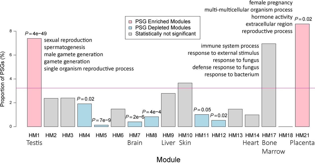 Percentage of PSGs within each coexpression module generated based on HPA adult tissue transcriptome. The genome-wide percentage of PSGs (3%) is indicated with a horizontal pink line, whereas modules exhibiting a significant excess or paucity (Bonferroni-corrected P < 0.05) of PSGs are indicated in light red and light blue, respectively. Nonsignificant categories are shown in gray. The corresponding multitesting adjusted P-values are marked above the boxes. The seven tissue-biased modules are labeled with their corresponding tissue names. For testis-biased, bone marrow–biased, and placenta-biased modules, the top five significantly enriched GO terms are shown.