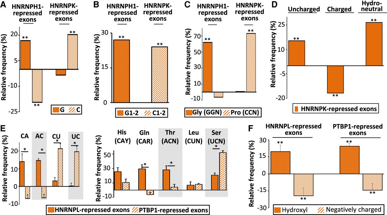 HNRNP-corepressed exons code for amino acids with similar physicochemical properties. (A) Relative frequency (%), when compared to sets of control exons, of G and C nucleotides in HNRNPH1- and HNRNPK-repressed exons identified in 293T and GM19238 cells, respectively: (**) randomization test FDR < 0.006. (B) Relative frequency (%), when compared to sets of control exons, of G (G1–2), or C (C1–2) nucleotides at the first and second codon position from HNRNPH1- or HNRNPK-repressed exons identified in 293T and GM19238 cells, respectively: (**) randomization test FDR < 0.003. (C) Relative frequency (%), when compared to sets of control exons, of glycine (Gly corresponding to GGN codons) and proline (Pro corresponding to CCN codons) encoded by HNRNPH1- and HNRNPK-repressed exons identified in 293T and GM19238 cells, respectively: (**) randomization test FDR < 0.05. (D) Relative frequency (%), when compared to sets of control exons, of polar uncharged, charged, or neutral (in terms of hydropathy) amino acids encoded by HNRNPK-repressed exons identified in GM19238 cells: (**) randomization test FDR < 1 × 10−4. (E) The left panel represents the average of the relative frequency (%), when compared to sets of control exons of CA, CT, AC, and TC dinucleotides calculated from four sets from different cell lines of HNRNPL- or PTBP1-repressed exons. The right panel represents the average of the relative frequency (%), when compared to sets of control exons of histidine (His corresponding to CAY codons), glutamine (Gln corresponding to CAR codons), leucine (Leu corresponding to CTN codons), threonine (Thr corresponding to ACN codons), and serine (Ser corresponding to TCN codons) encoded by four sets of HNRNPL- and PTBP1-repressed exons. A Mann–Whitney U test was used to compare whether the real frequencies of those amino acids and dinucleotides between HNRNPL- and PTBP1-repressed exons: (*) P-value < 0.03. (F) Relative frequency (%), when compared to sets of control exons, of hydroxyl-containing and negatively charged amino acids encoded by HNRNPL- or PTBP1-repressed exons. The average values of four data sets are represented for HNRNPL and PTBP1: (**) Mann–Whitney U test P-value < 0.03.