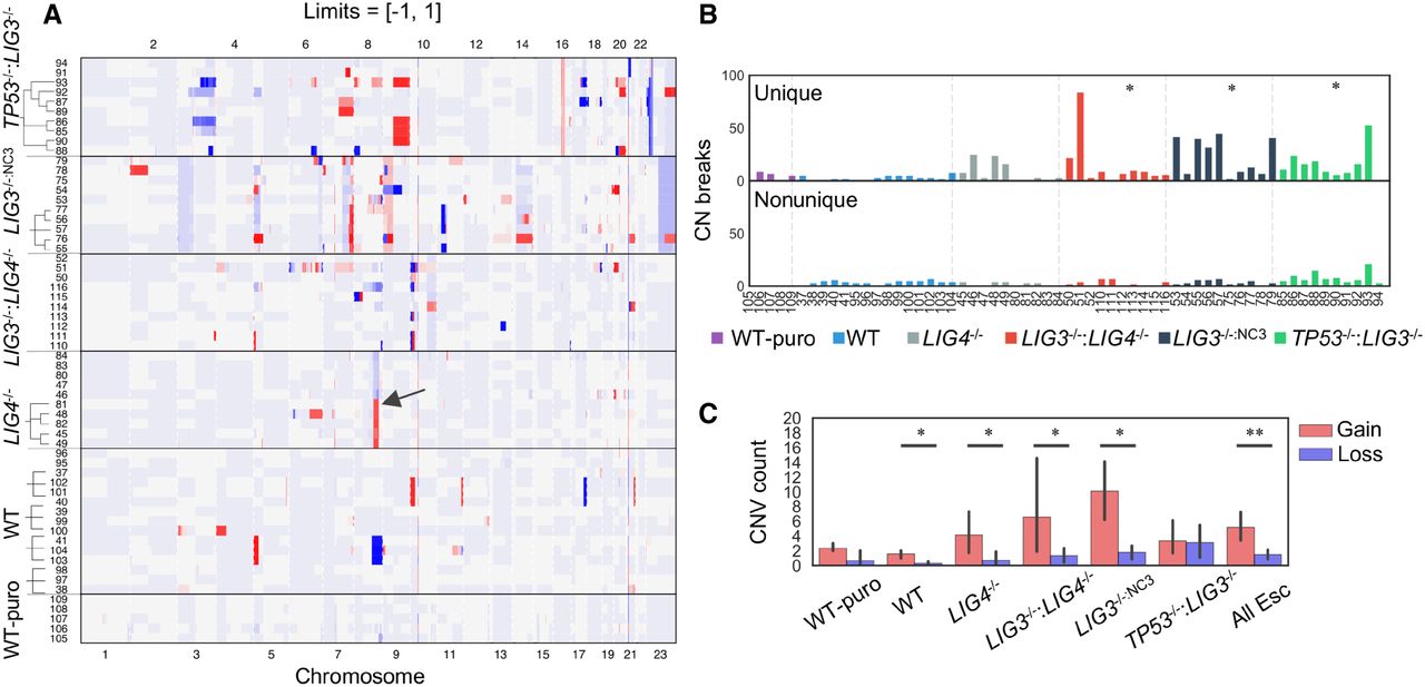 Copy number (CN) variation associated with a telomere crisis. (A) Cell lines with deficiencies for C- and A-NHEJ were driven through a telomere crisis by expression of DN-TERT with clonal selection occurring either pre- or post-crisis. Genomic CN changes of clones are presented as normalized values relative to the parental lines within the limits of +1 gain and −1 loss. Some samples appeared to share common CN breakpoints with other samples of the same genetic background, with an example from LIG4−/− Chr 8q highlighted with a black arrow. (B) Unique and nonunique breaksites were analyzed, revealing an increase in unique sites for LIG3−/−:LIG4−/−, LIG3−/−:NC3, and TP53−/−:LIG3−/− samples relative to WT. (*) P-value <0.002, Mann–Whitney U test. (C) CN segments for which both breaksites were unique were quantified, indicating a prevalence of CN gains relative to losses. (*) P-value <0.03. “All Esc” refers to a pooled analysis of all post-crisis clones. (**) P-value <2 × 10−5, Mann–Whitney U test.