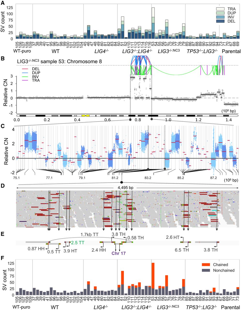 Identification of genome catastrophe in post-crisis clones. (A) The number of deletions (DEL), inversions (INV), duplications (DUP), and translocations (TRA) for all samples were quantified. (B–E) An example of a complex rearrangement is illustrated. To visualize the dense spatial clustering of breaks present in B, the lengths of segments separating neighboring breakpoints were transformed to a log10 scale. A region from Chr 8, indicated by black dotted lines, has been transformed in this way with the linear scale illustrated in the lower half of panel C. A further subsection of this rearrangement, highlighted with black dotted lines, is expanded in D, showing a 4.5-kb span with 14 breakpoints. (E) Assembly of discordant reads from this region was performed to aid in interpretation. Join types are given by a two-letter code corresponding to the head (H) or tail (T) ends of fragments. The distance to partner fragments is given in Mb with the arrow specifying the direction. The breakpoint colored in green was missed during SV calling. (F) Applying a clustering procedure, the number of SVs that resembled a chainlike pattern was quantified for each sample.