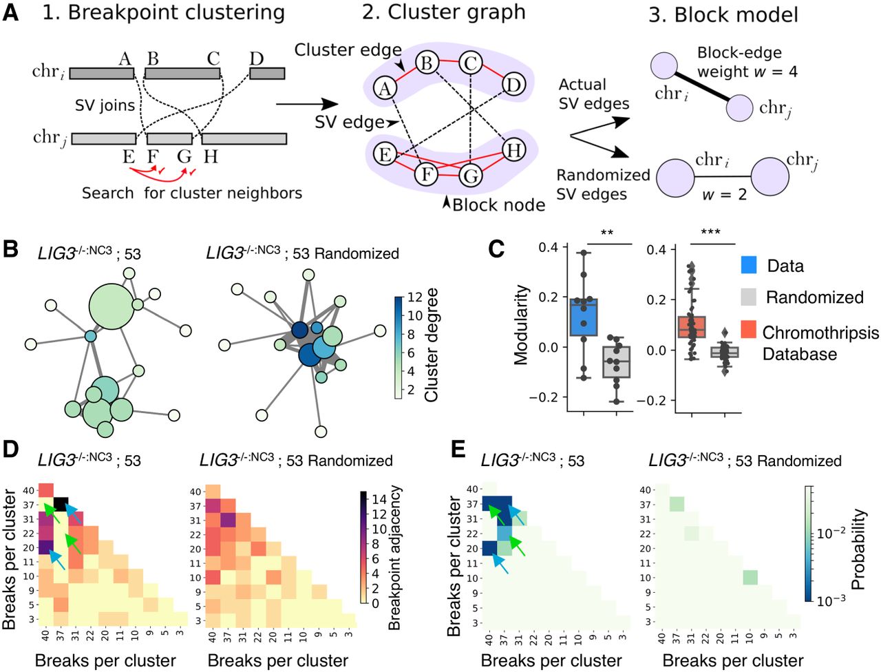 Network analysis reveals genome catastrophe joining is nonrandom. Chained breakpoints were grouped into local clusters using a statistical clustering procedure (A1) and represented as a cluster graph (A2). Components of the cluster graph that were connected by cluster edges (red edges, A2) were partitioned using a block model, so each node in the block model corresponds to a single cluster of breakpoints (A3). The example in A shows two clusters of breakpoints on chri and chrj that are then partitioned into a block model with two nodes. Block-node diameter relates to the numbers of intracluster SVs, whereas edge thickness (weight [w]) symbolizes the number of SVs between two clusters. Block-node color represents the degree or number of SVs between all neighboring clusters. (B) A chain from LIG3−/−:NC3; sample 53 has been displayed in this manner along with an equivalent graph with randomized SV edges to reflect a random end-joining process. (C) The modularity coefficient for all chain-graphs was calculated, alongside data downloaded from the chromothripsis database (Yang et al. 2016). (D) Block models were represented as adjacency matrices, with each row and column corresponding to a cluster of breakpoints with the color depicting the number of intercluster SVs (nondiagonal cells) or intracluster SVs (diagonal cells). (E) Using simulation, the distributions of adjacency values were determined for the randomized data, allowing the probability of the observed adjacency values to be estimated, assuming a random model of end joining. Blue arrows in D and E highlight examples of clusters with more linkages than expected, whereas green arrows indicate fewer linkages.