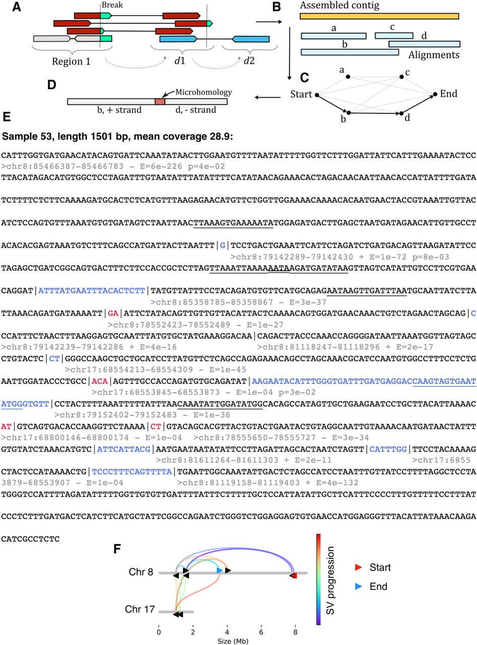 Assembly of complex SVs reveals signatures of replicative repair. (A) Reads were collected from breakpoint regions before recursively fetching mate pairs from distal genomic loci. (B) Reads were then assembled into contigs and aligned to the reference genome. An optimal set of alignments was then determined using the fnfi align algorithm https://github.com/kcleal/fnfi (C) before further annotation of the contigs (D). (E) An example contig from LIG3−/−:NC3:sample 53 is provided with the following annotations: Black text demarcates alignment to the reference genome, whereas red and blue indicate sections of microhomology and novel sequence insertions, respectively. Below the start of each alignment, the genomic interval is given along with the DNA strand and an E-value for the alignment. An additional annotation is added to lines for which adjacent alignments show significant levels of similarity with respect to one another, as determined by a statistical test, giving the probability “p” indicated in the annotation. Significant stretches of similarity have been underlined in adjacent segments and overlapping annotations appear as a double underlined stretch. (F) The progression of rearrangement over the reference genome is depicted.