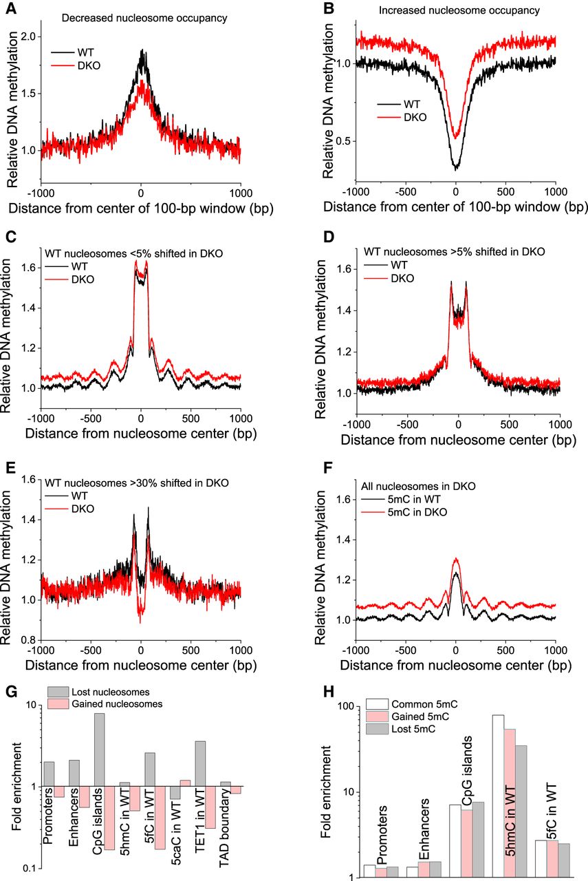 DNA methylation is associated with nucleosome repositioning. (A,B) Relative DNA methylation is shown around centers of 100-bp genomic regions with lost (A) and gained (B) nucleosome occupancy. (C–F) Changes in DNA methylation were associated with shifted nucleosomes. Relative DNA methylation is plotted as a function of the distance from the centers of nucleosomes on Chromosome 19 determined by paired-end MNase-assisted H3 ChIP-seq. Black lines indicate DNA methylation in WT; red lines, DNA methylation in DKO ESCs. Within each plot, WT and DKO methylation was normalized in the same way and is quantitatively comparable. (C) Common nucleosomes whose boundaries change <5% between WT and DKO ESCs (>95% overlap between the bodies of the corresponding paired-end reads in WT and DKO cells). (D) Nucleosomes in WT cells whose boundaries were changed in DKO by >5% (<95% overlap). (E) Nucleosomes in WT cells whose boundaries were changed in DKO by >30% (<70% overlap). (F) All nucleosomes in DKO ESCs. (G) Fold enrichment of lost/gained nucleosomes at different genomic features. (H) Fold enrichment of common/gained/lost 5mC at genomic features.