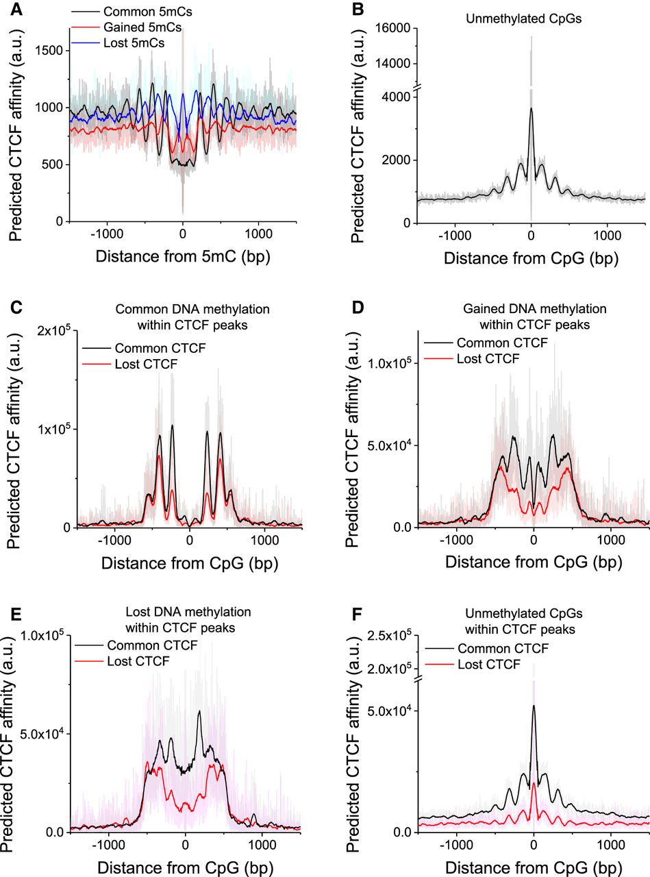 CTCF-DNA binding affinity predicted from the DNA sequence as a function of distance from CpGs. (A,B) Calculations performed for four classes of CpGs genome-wide. (A) CpGs that were commonly methylated in both cell states (methylation >0.8 both in WT and DKO cells; N = 10,439,081), that gained methylation (<0.2 in WT and >0.5 in DKO ESCs; N = 9,596,997), and that lost methylation (>0.5 in WT and <0.2 in DKO ESCs; N = 6,859,738). (B) Unmethylated CpGs (<0.2 in both WT and DKO; N = 15,316,892). (C–F) Calculations performed only for CpGs within CTCF ChIP-seq peaks in WT. (C) Common 5mC sites inside common (N = 25,740) and lost (N = 33,060) CTCF peaks. (D) Gained 5mC sites inside common (N = 37,702) and lost (N = 35,518) CTCF peaks. (E) Lost 5mC sites inside common (N = 35,632) and lost (N = 35,527) CTCF peaks. (F) Unmethylated CpGs inside common (N = 460,752) and lost (N = 179,288) CTCF peaks.