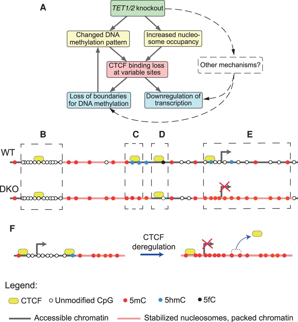 A scheme of different regimes of CTCF sensitivity to DNA modifications. (A) Simplified scheme of the possible causality of events: Tet1/2 knockout leads to the changed DNA methylation pattern and increased nucleosome occupancy. These lead to CTCF binding loss at variable sites. As a result, methylation spreads to larger areas, and neighboring genes are down-regulated. (B) Common CTCF sites were significantly enriched at CpG islands where DNA was unmethylated in both cell types, and CTCF binding was mostly determined by the DNA sequence. (C) CTCF sites marked by 5hmC in WT were predisposed for loss of CTCF binding in DKO cells, which could be accompanied by a 5hmC/5mC switch and the loss of 5hmC. (D) Regions near 5fC sites were more enriched for common than for lost CTCF sites. (E) CTCF loss at promoters and in the vicinity of genes may lead to the spreading of DNA methylation into neighboring regions as a function of the distance from the CTCF site. Genes inside such regions tend to become down-regulated in DKO ESCs. (F) In some cases, methylation of a single CpG inside a CTCF binding site may lead to CTCF removal, or vice versa, and results in the loss of the boundary between methylation microdomains. This process may induce a subsequent change of transcription, as shown for an example genomic region in Supplemental Figure S27.
