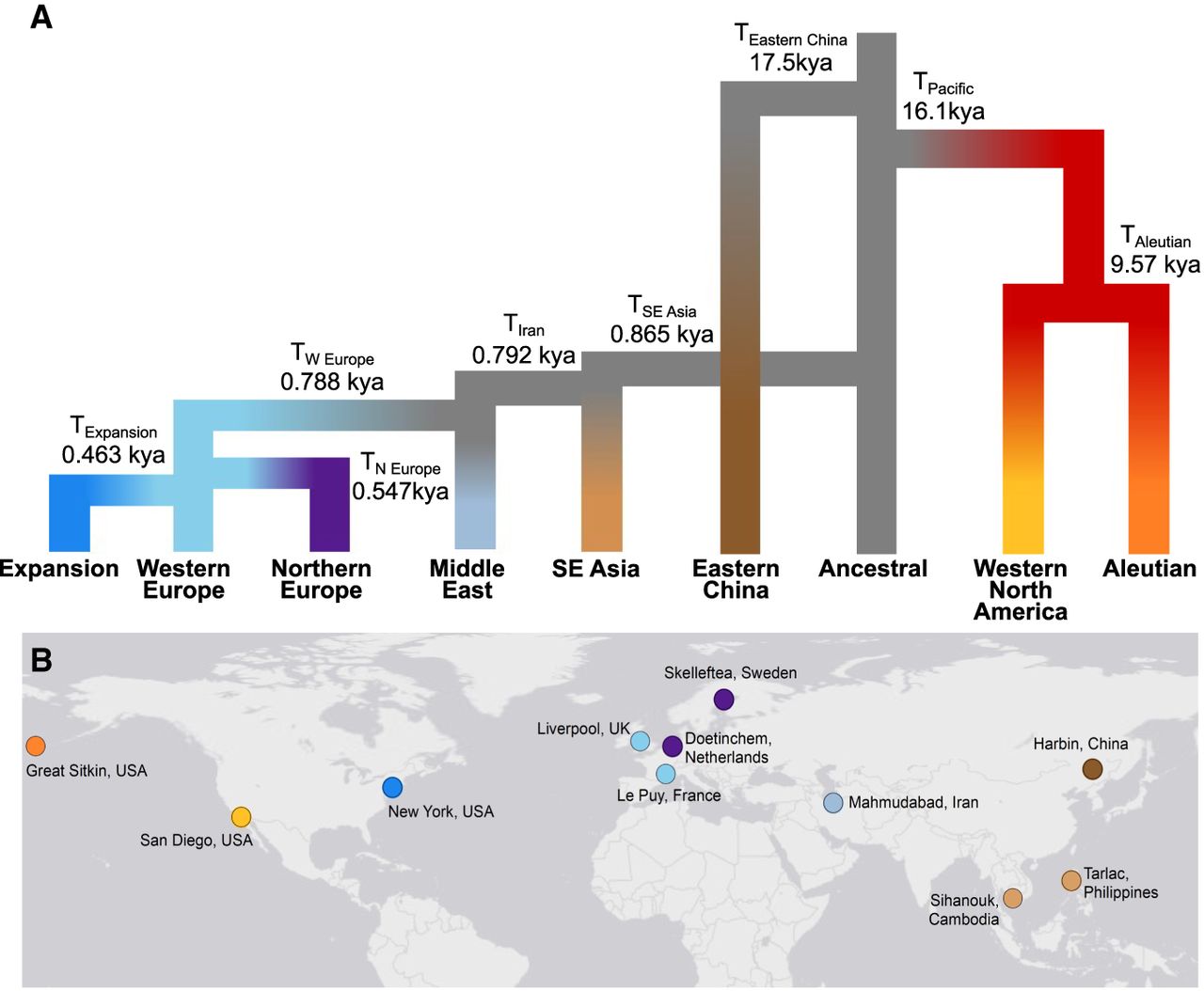Inferred population tree topology and divergence times for the global expansion of brown rats. (A) The best-supported demographic model contained nine evolutionary clusters inclusive of two unsampled populations. The divergence times in generations and Ne are listed in Table 1. (B) Map of global sampling locations for the WGS demographic model in which evolutionary clusters were represented by different colors: Eastern China, dark brown; SE Asia, light brown; Aleutian, orange; Western North America, yellow; Middle East, gray-blue; Northern Europe, purple; Western Europe, light blue; and Expansion, medium blue.