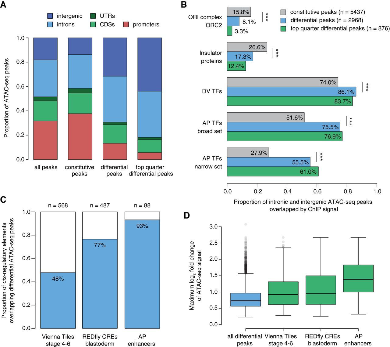 Differential ATAC-seq peaks display strong features of axis patterning enhancers. (A) Proportional distribution of genomic annotations among different classes of accessible regions: all high-confidence ATAC-seq peaks (all peaks), constitutive peaks, differential peaks, top quarter of differential peaks (highest values of maximum log2 fold-change reported in DESeq2) (Supplemental Fig. S10). (UTR) 5′ and 3′ untranslated regions, (CDS) coding sequence. (B) Bar plot shows the proportion of different classes of ATAC-seq peaks that map to intronic and intergenic regions (numbers of intervals in the legend) and colocalize with ChIP signal of different classes of proteins. (ORI complex) ChIP-seq peaks of ORC2 (origin recognition complex subunit 2) (Eaton et al. 2011), (Insulator proteins) ChIP-chip peaks of BEAF-32, CP190, CTCF, and Su(Hw) (Celniker et al. 2009), (DV TFs) ChIP-chip peaks of four maternal and zygotic DV TFs: Dorsal, Mothers against dpp, Snail, and Twist (MacArthur et al. 2009), (AP TFs [broad set]) ChIP-chip peaks of 14 maternal, gap, and pair-rule AP TFs: bicoid, caudal, giant, hunchback, knirps, Kruppel, huckebein, tailless, Dichaete, fushi tarazu, hairy, paired, runt, and sloppy paired 1 (Li et al. 2008; MacArthur et al. 2009), (AP TFs [narrow set]) ChIP-seq peaks of six maternal and gap AP TFs: Bicoid, Caudal, Giant, Hunchback, Knirps, and Kruppel (Bradley et al. 2010). Asterisks indicate significant differences between constitutive and differential peaks; (***) P < 0.0001, Fisher's exact test. (C) Bar plot shows the proportion of annotated CREs that overlap differential peaks. Total number of CREs from each category is indicated above the bars: Vienna Tiles (Kvon et al. 2014) active at stage 4–6, REDfly CREs (Gallo et al. 2011) active in blastoderm embryos, and AP enhancers driving patterned expression specifically along the AP axis (Supplemental Table S8). (D) Box plots show distributions of maximum log2 fold-change of accessibility signal reported for all differential peaks (blue) and differential peaks overlapping the three categories of annotated CREs (green).