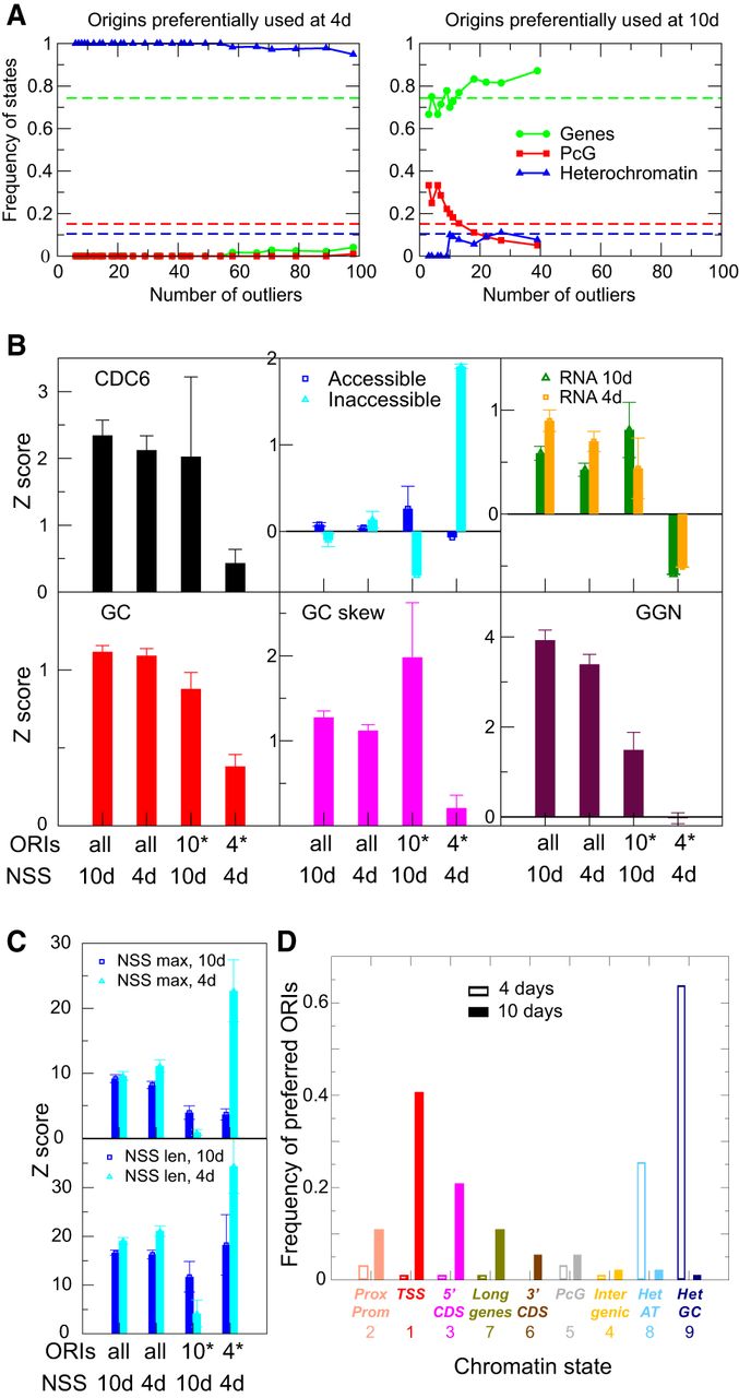Properties of differentially activated ORIs during vegetative development. (A) Distribution into chromatin states of ORIs stronger in 4-d-old seedlings (left) or in 10-d-old seedlings (right), as a function of the number of ORIs obtained by varying the threshold. To simplify the analysis, ORIs have been grouped into those associated with genes (states 2, 1, 3, 7, and 6), with Polycomb chromatin (states 4 and 5), and with heterochromatin (states 8 and 9). Dotted lines represent the average values for the entire genome. (B) Weighted average of several genomic and epigenomic properties for the set of all ORIs and the ORIs preferred at 4- or 10-d-old seedlings, as indicated. For the set of all ORIs, we have used as weight the NSS of the two developmental stages. For the sets of differentially expressed ORIs, we have only used the stronger weight. Measurements were transformed to Z-score with respect to the whole genome, which produces positive values when they are higher than a generic genomic region. (C) Weighted average of the scores NSSmax (upper) and NSSlen (lower) measured at 10 d (dark blue) and 4 d (light blue) for the set of all ORIs weighted with the NSS of the two developmental stages and the set of differentially expressed ORIs weighted with the stronger NSS. Note that although ORIs stronger at 10 d have weak NSS score both at 4 and 10 d, ORIs stronger at 4 d have a score weak at 10 d but strong at 4 d. (D) Distribution into chromatin states at the reference threshold t = 0.9 of ORIs preferentially used at two developmental stages defined as in A colocalizing with different chromatin states in 4-d-old (empty bars) and 10-d-old seedlings (solid bars).