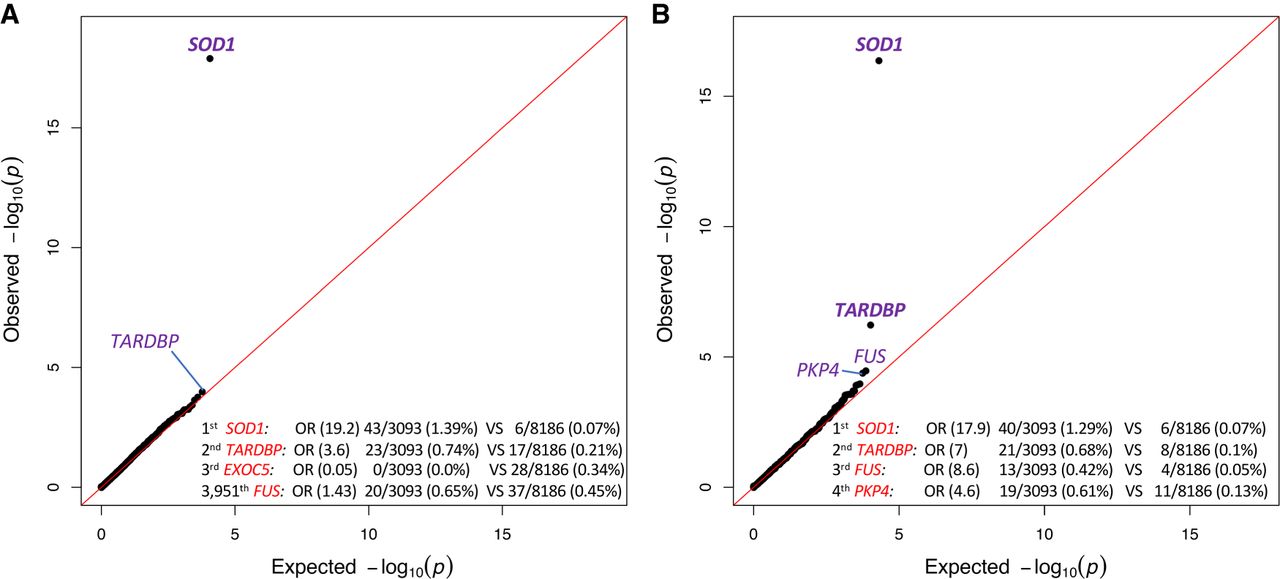 Q-Q plots of gene- and domain-level collapsing. (A) The results for a standard gene-level collapsing of 3093 cases and 8186 controls; 18,065 covered genes passed QC with more than one case or control carrier for this test. The genes with the top associations and FUS gene are labeled. The genomic inflation factor, lambda (λ), is 1.10. (B) The results for the domain-based collapsing of 3093 cases and 8186 controls; 70,603 covered domains passed QC with more than one case or control carrier for this test. The genes with the top associations are labeled and genome-wide significant genes are in bold. λ = 1.046.