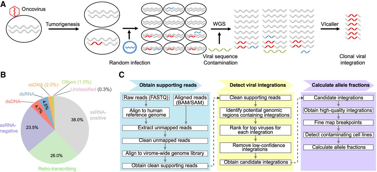 Discovering oncovirus candidates through identification of clonal viral integrations. (A) Identification of clonal viral integrations to eliminate viral sequence contaminations and to prove the involvement of the identified virus in the early stages of tumorigenesis. (B) Composition of VIcaller virome-wide genome reference library. (C) The simplified analytic workflow of VIcaller.