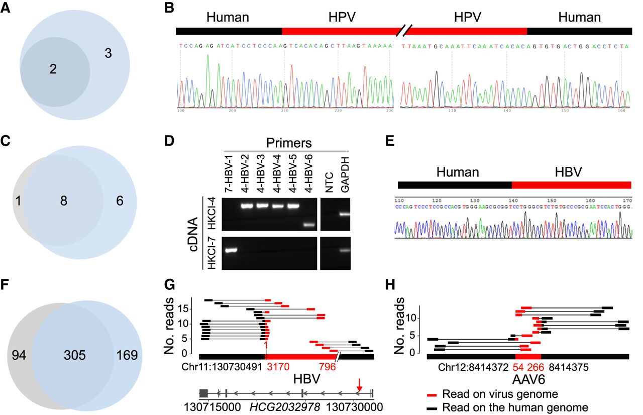 Virome-wide integrations detected in liver and cervical cancer genome data sets. (A) Comparison of the number of integration events identified in a metastatic cervical carcinoma sample by our VIcaller approach (light blue) and the HPV-specific approach of the original study (Liang et al. 2014) (light gray). (B) Sanger sequencing result for one example of the three HPV-18 integrations, newly detected by VIcaller, that existed in the tumor but not in the paired normal tissue. A 16-bp deletion on the human genome was found at the integration breakpoint. (C) Comparison of the number of HBV-human fusion transcripts identified in three HCC cell lines by the VIcaller virome-wide approach (light blue) and the HBV-specific approach described in the original study (light gray) (Lau et al. 2014). (D) Gel images from RT-PCR validation of the six fusion transcripts newly detected by VIcaller. (E) Sanger sequencing result of an example breakpoint of the six newly identified fusion transcripts. (F) Comparison of the number of HBV integration breakpoints identified in 88 HCC samples by our VIcaller virome-wide approach (light blue) and the HBV-specific approach described in the original study (light gray) (Sung et al. 2012). (G) Sequence read alignment of an HBV integration in the HCG2032978 gene, newly identified by VIcaller, which existed in the tumor but not in the paired normal tissue. Seven chimeric and seven split reads at the upstream breakpoint and four chimeric reads at the downstream breakpoint were found for this integration event. The integrated HBV sequence is ∼808 bp in length, starting from 3170 bp to 3182 bp, and then from 1 bp to ∼796 bp on the circular HBV genome. Black and red represent reads mapped to the human (hg19) and HBV (NC_003977.2) reference genomes, respectively. (H) Sequence read alignment of an adeno-associated virus 6 (AAV-6; AF028704.1) integration event detected by VIcaller (sample ID: 55T) that existed in the tumor but not in the paired normal tissue. Eight chimeric and five split reads were found across the two breakpoints. This integration is 212 bp in length, from 54 bp to 266 bp on the AAV-6 genome.