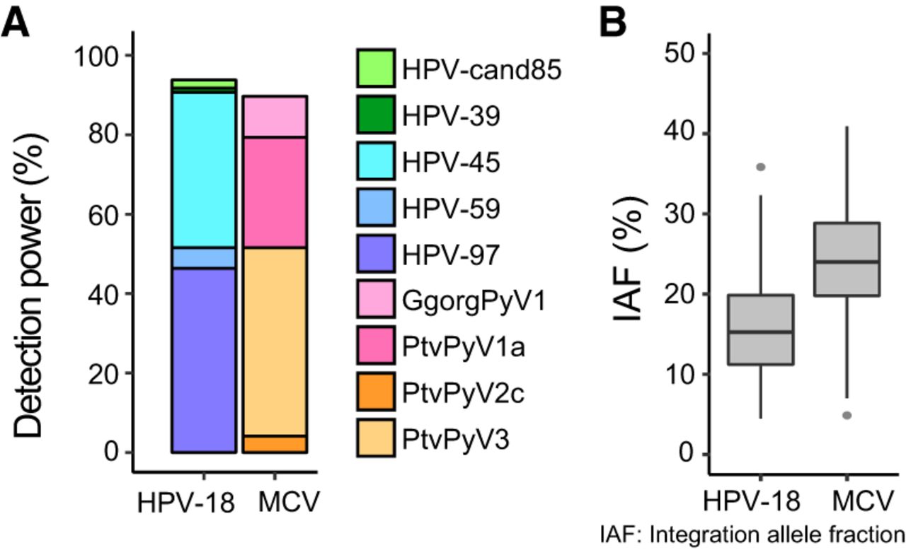Viruses and integration events detected after removing the target viral genomes from our virome-wide database. (A) Percentage of simulated integrations detected after removing the HPV-18 (left) or MCV (right) references. (B) Integration allele fraction detected after removing the HPV-18 (left) or MCV (right) references. Three detected integration events that had >50% fractions are not shown in the figure, including two among the 91 HPV-18 events, and one among the 87 MCV events.