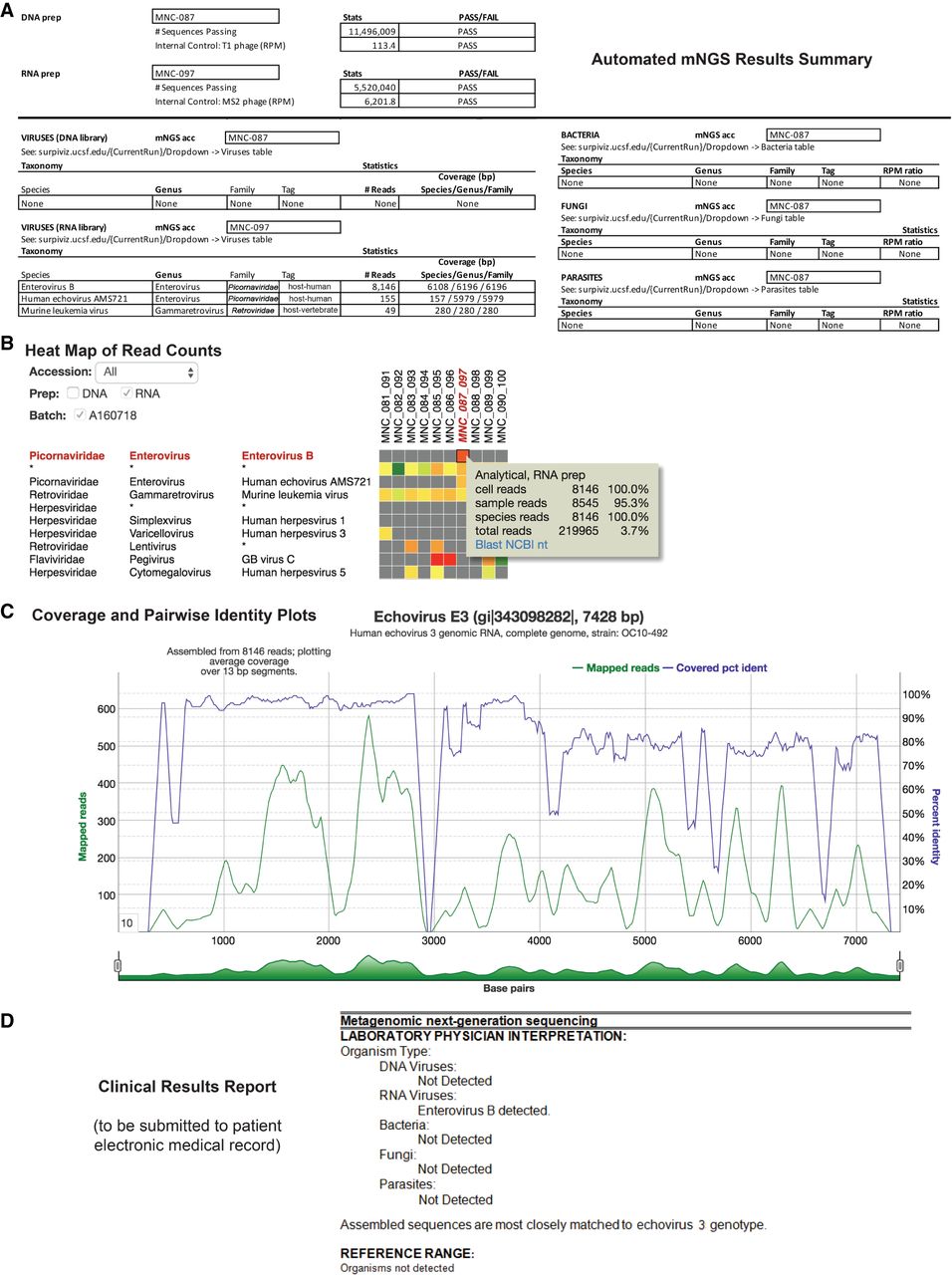 Identification and reporting of enterovirus infection in a patient with meningoencephalitis using a clinical CSF mNGS assay. SURPI+ provides tools to aid clinical interpretation and graphical visualization (the SURPIviz package), including (A) an automated mNGS results summary, (B) a heat map of aligned reads corresponding to detected pathogens, and (C) a coverage plot (green line) of reads corresponding to a detected pathogen that are mapped to the most closely matched genome or gene in the reference database, along with a corresponding pairwise identity plot (purple line, sliding window = 10 nt). Viral hits corresponding to one CSF patient sample (MNC_087_097, column highlighted in red in B) are taxonomically identified as enterovirus (enterovirus B and echovirus AMS721 species) and murine leukemia virus, a known reagent contaminant (Zheng et al. 2011). After an interpretive review, a laboratory physician prepares a clinical results report (D) that is submitted to the patient electronic medical record (EMR).