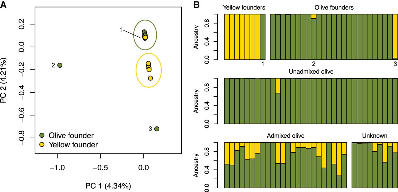 Genetic ancestry patterns in baboons from the SNPRC. (A) PCA shows that olive and yellow baboon founders form distinct clusters, but one olive baboon was mislabeled as a yellow baboon (1: 1X3576), and two other individuals are extreme outliers (2: 1X0812, 3: 1X4384). (B) Similarly, ADMIXTURE results under a model of two ancestral populations (K = 2) show that patterns of olive and yellow baboon ancestry are not always concordant with given species labels. Individuals labeled as 1, 2, and 3 in the PCA are indicated. Individuals are grouped according to their classification from the colony records (see Supplemental Table S1).