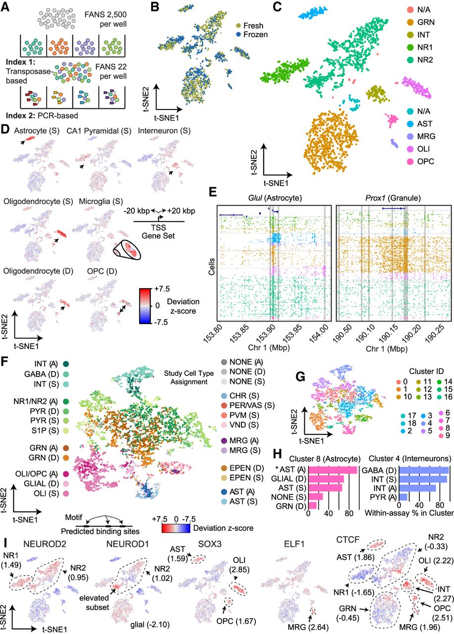 sci-ATAC-seq of the murine hippocampus. (A) sci-ATAC-seq workflow. Two indexes are incorporated into library molecules for each cell, enabling single-cell discrimination. (B) LSI-t-SNE projection of single cells colored by tissue preparation method. Little variation in t-SNE space is observed between the fresh or frozen starting material. (C) LSI-t-SNE projection of cells colored by assigned cluster and cell type. (D) Enrichment of accessibility of proximal regulatory elements for marker genes as identified by single-cell RNA-seq (Smart-seq protocol [S]) (Zeisel et al. 2015) and DroNc-seq (D) (Habib et al. 2017) for each cell. The microglial population is enlarged for visibility. Black arrows indicate the cell cluster associated with the marker gene set. (E) sci-ATAC-seq read plots at Glul (astrocyte marker gene) and Prox1 (dentate granule cell marker gene). (F) Coembedding (t-SNE) of single-cell RNA-seq and DroNc-seq cells from D with our sci-ATAC-seq cells using Seurat3. Cells are colored by their study: “A” designates this study, “D” designates cells from Habib et al. (2017), and “S” designates cells from Zeisel et al. (2015). Cell type designation is from their published study (RNA) or our designations (for the sci-ATAC-seq cells). (G) PhenoGraph cluster designations on the coembedded cells. (H) Representative cluster cell compositions. The percentage of cells within each of the three assays that were assigned to the coembedding cluster using PhenoGraph is reported. For example (noted by an asterisk), in Cluster 8, 93.0% of the sci-ATAC-seq cells that were assigned to Cluster 8 were designated as astrocytes. (I) chromVAR global motif deviation Z-scores for each cell for select motifs. Dashed lines and values correspond to mean values of cell populations.