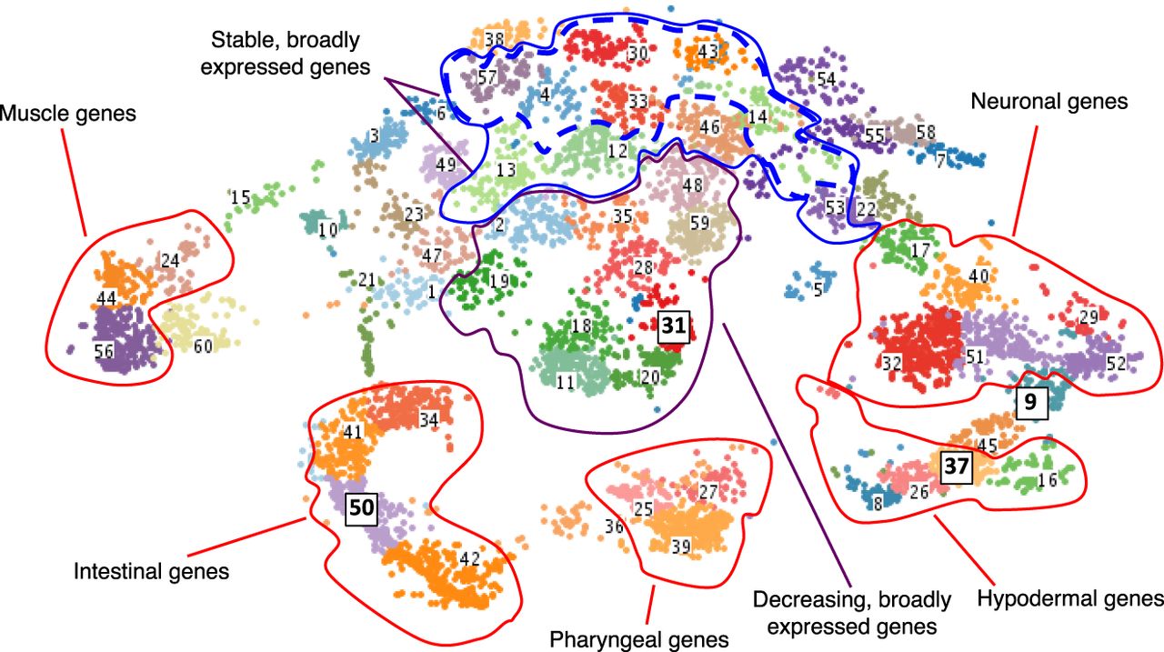 Clustered gene expression visualized with t-SNE. Gene expression values (TPM) were clustered using fuzzy k-means clustering and then visualized in t-SNE space to group genes with similar expression patterns. Genes that have enriched expression based on tissue are clustered outward from nonenriched genes in the plot and separated based on their specific tissue enrichment (outlined in red). Within nontissue enriched genes, the separation of genes into clusters is often temporal in nature, with stably expressed genes appearing in clusters toward the top of the plot (blue outline) and broadly expressed genes that are dropping in expression value located in the very center of the plot (purple outline). Clusters with the highest proportion of stable and broadly expressed genes are outlined in a dashed blue line. Clusters discussed in more detail in the text and in Figure 3 are highlighted with boxes around the label and larger font size.