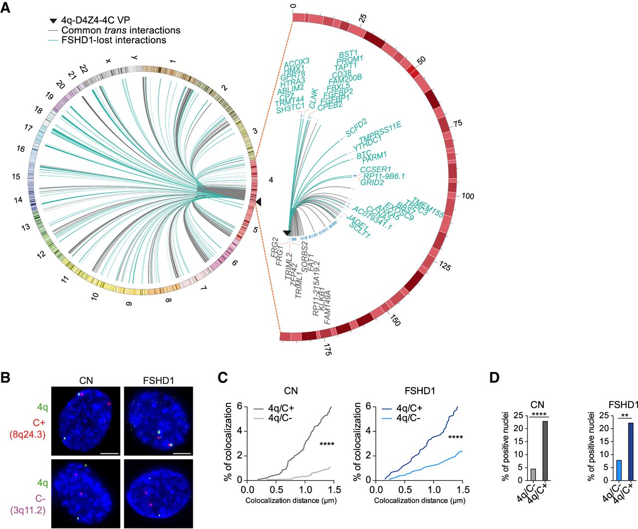 4q-D4Z4–specific 4C-seq highlights FSHD1 impaired interactome. (A, left) Circos plot (Krzywinski et al. 2009) depicting cis and trans 4q-D4Z4 interactions in CN (CN-3, CN-4) myoblasts (MBs) called by 4C-ker. Common interactions with FSHD1 (FSHD1-3, FSHD1-4) MBs are in gray, whereas interactions specifically lost in FSHD1 are highlighted in light blue. (Right) Zoomed-in Circos plot representation of common (gray) and FSHD1 lost (light blue) cis interactions on Chr 4. Genes are indicated for a region extending up to 4 Mb from the VP. Black triangles in Circos plots depict the VP localization. (B) Representative nuclei of 3D multicolor DNA FISH using probes mapping to 4q35.1 region (4q; green), a 4q-D4Z4–positive interacting region (8q24.3, C+; red), and a 4q-D4Z4 not interacting region (3q11.2, C−; magenta) in CN (CN-1, CN-2, CN-3, CN-4) and FSHD1 (FSHD1-1, FSHD1-2, FSHD1-3, FSHD1-4) MBs. Nuclei are counterstained with DAPI (blue). All images at 63× magnification. Scale bar, 5 µm. (C) Cumulative frequency distributions of distances (below 1.5 µm) between 4q and C+ and between 4q and C− in CN (dark and light gray; left) and FSHD1 (dark and light blue; right) MBs. n = 1296 (CN 4q/C+), 1708 (CN 4q/C−), 884 (FSHD1 4q/C+), and 1128 (FSHD1 4q/C−). P-values were calculated by unpaired one-tailed t-test with a confidence interval of 99%. Asterisks represent statistical P-values: for 4q/C+ versus 4q/C− in CN and FSHD1, P < 0.0001. (D) Percentage of nuclei positive for the interactions (under the cutoff of 1.5 µm). n = 427 (CN 4q/C−), 324 (CN 4q/C+), 282 (FSHD1 4q/C−), and 221 (FSHD1 4q/C+). P-values were calculated by Fisher's exact one-sided test with a confidence interval of 99%. Asterisks represent statistical P-values: for 4q/C− versus 4q/C+ in CN, P < 0.0001; for 4q/C− versus 4q/C+ in FSHD1, P = 0.0046.