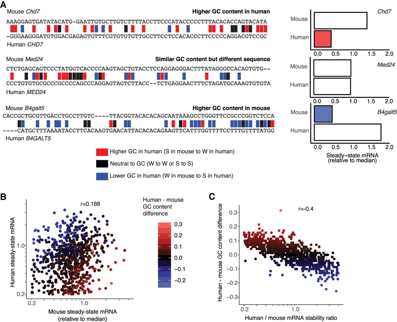 Changes in GC content between rapidly evolving mouse and human 3′ UTR sequences determine mRNA stability in fast-UTR reporter assay. (A) Example alignments (left) of rapidly evolving mouse GCLiPP peaks and human syntenic regions showing higher (Chd7), similar (Med24), or lower (B4galt5) GC content in the mouse sequence, with individual sequence fast-UTR measurements shown to the right. Correlation between steady-state mRNA abundance for rapidly evolving mouse GCLiPP peaks and corresponding human syntenic regions in mouse T cell fast-UTR assay (B) and difference in GC content between rapidly evolving mouse GCLiPP peaks and syntenic human regions (C) and ratio of fast-UTR steady-state mRNA abundance for the same. (r) Pearson correlation coefficient.