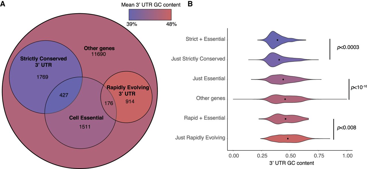 Cell-essential genes have 3′ UTRs with lower than average GC content. (A) Venn diagram depicts mean overlap of cell-essential genes with classes of genes determined to have a strictly conserved or rapidly evolving 3′ UTR as defined in Figure 6. The color of each region reflects mean GC content of 3′ UTRs therein. (B) Identically color-coded violin plot shows the distribution of GC content of 3′ UTRs for the indicated gene groups depicted in the Venn diagram.
